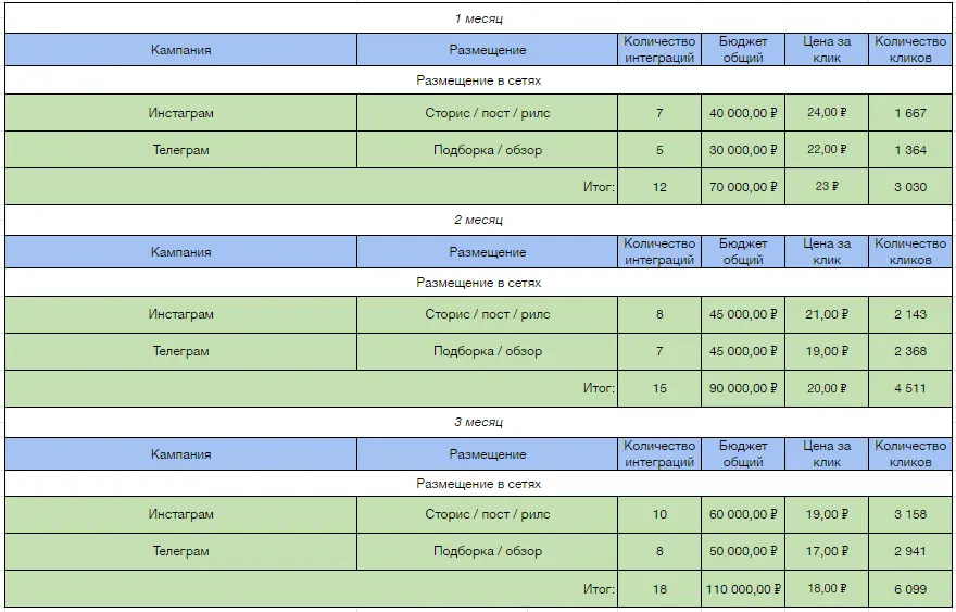 Прогноз делается на основе данных с открытых источников, которые предоставляет сервис seller.ozon.ru. Мы можем посмотреть статистику по любой товарной карточке. Самые важные показатели — это количество продаж и сессий за последние 28 дней ( органический трафик Ozon ). Имея эти данные мы можем посчитать, какая конверсия из визита товарной карточки в покупку. Кол-во сессий/кол-во продаж = CV в покупку. Также, мы можем сделать прогноз по предполагаемой цене клика трафика из социальных сетей, это может быть: телеграмм, инстаграм*, вконтакте, ютуб или любая другая социальная сеть. В данном случае рассмотрим самые популярные — это инстаграм* и телеграм. Имея опыт размещения рекламы в социальных сетях — можно сделать прогноз по цене клика. Зная планируемый бюджет на рекламу мы можем предположить, сколько будет переходов в товарную карточку. В данном примере показан план на 3 месяца по количеству трафика из социальных сетей. Наша команда проанализировала нишу и на основе своего опыта предположила какая может быть стоимость клика. Каждый месяцем цена клика снижается на 20-30% — это происходит во многом за счет подбора более релевантных креативов, повторных размещений и эффекта снежного кома ( частые упоминания бренда увеличивают его популярность и как следствие доверие ). Понимая какое количество трафика мы приведем с рекламы и конверсию в покупку по товарной карточке, мы можем сделать прогноз по цене заказа с приводимого трафика. 2. Логика прогноза Статистика которую мы видим на Ozon — это во многом органический трафик, у такого трафика как правила CV в покупку выше чем у рекламного. CV органического трафика в покупку зависит от спроса и времени, с момента размещения карточки. Если товар на маркетплейсе представлен уже давно, то вероятнее всего, в этой статистике мы видим и повторных покупателей. Рентабельность запуска рекламы зависит во многом от маржинальности продукта. В нашей практике, часто происходит так, что к нам обращаются бренды с продукцией на маркетплейсах, в которых средний чек от 500 — 1 000 р, это часто бренды с продукции из категории косметика, дом и сад и тд, где обычно невысокий средний чек. Делая прогноз ( кол-во холодного трафика умножаем на % конверсии ) цена заказа выходит дороже, чем сам продукт. Можно сделать вывод, что такой способ продвижения будет не выгоден. Но нужно брать во внимание такой показатель как LTV ( LTV = Lifetime × AOV × RPR, где: Lifetime — время активности покупателя. AOV — средний чек. RPR — частота повторных покупок ) и алгоритмы маркетплейса. LTV ( или цикл клиента ) - это количество повторных покупок совершенных одним клиентом. То есть если мы на на привлечение клиента потратили, допустим, 2000 р то когда он совершит повторную покупку, то стоимость заказа с этого клиента уже будет 1000 р, и если товар качественный, вероятнее всего, клиент продолжит пользоваться продуктом, тем самым повышая показатель LTV. Также, когда мы ведем большое количество трафика на товарную карточку, алгоритмы маркетплейса лучше ее ранжируют, те в поисковой выдаче товарная карточка будет выше, так как алгоритмы маркетплейса посчитают ее популярной. Если мы ведем холодный трафик то, вероятнее всего, % конверсии (CV ) в покупку упадет пропорционально доли холодного трафика. То есть, если количество органического трафика 2000 визитов и CV в покупку 10%, то приведя еще 2000 визито
