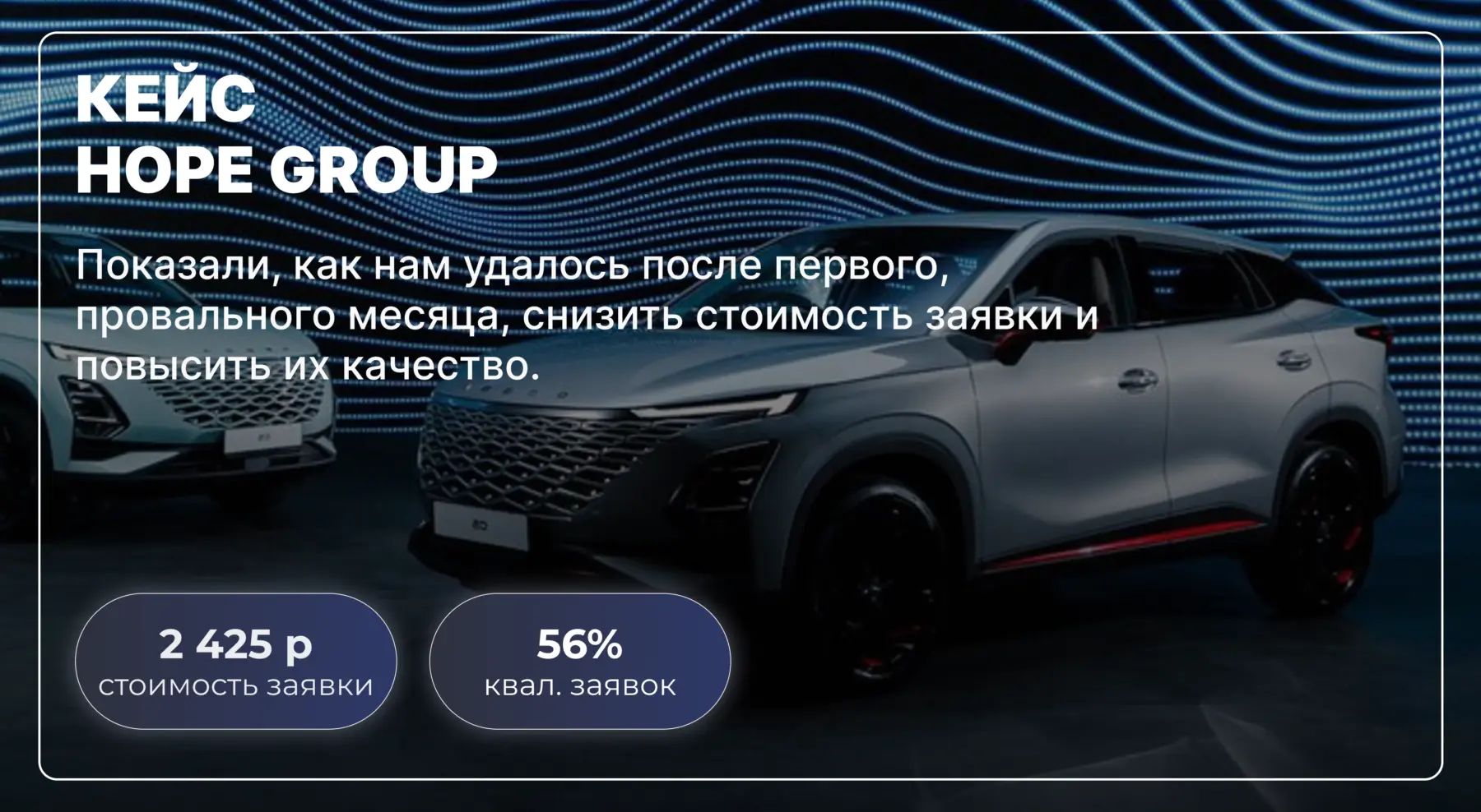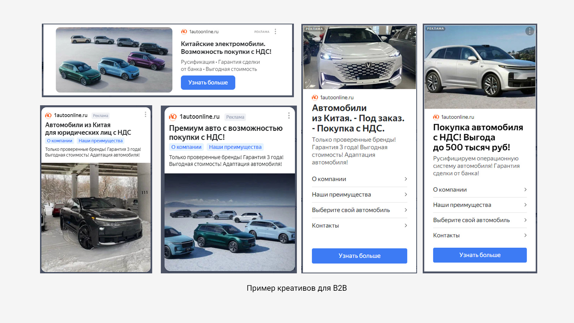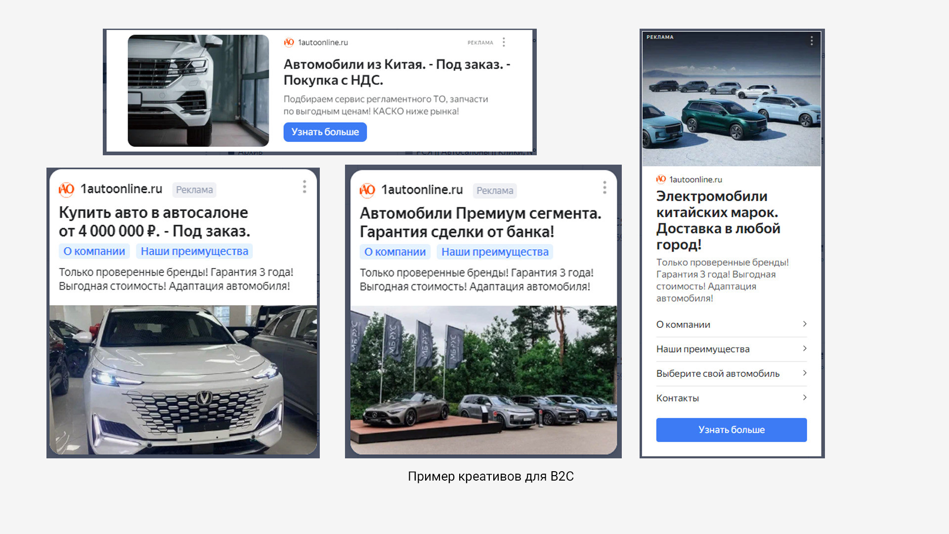 После оптимизации рекламной кампании отключаются невыгодные аудитории и средства перераспределяются на более выгодные — тем самым снижается цена заявки. Но чтобы найти эти выгодные связки аудитории и рекламных инструментов — нужно проводить тесты. Чудо, по нашему опыту, случается — но только там, где нет такой сильной конкуренции. Поэтому здесь чуда не ждали — а подошли к вопросу системно — т.е. у нас была стратегия и мы ее придерживались. Проведенные тесты выявили, что получение лидов через РСЯ оказывается более эффективным в сравнении с поиском. Это обусловлено рядом факторов, включая высокую конкуренцию в поисковой рекламы. В автомобильной нише стоимость привлечения трафика через поисковые системы значительно возрастает. Высокие ставки на ключевые слова, устанавливаемые конкурентами, существенно увеличивают стоимость клика и, следовательно, общие затраты на рекламу. Это означает, что для многих компаний становится сложнее конкурировать в поисковых системах, особенно для новых участников рынка или для тех, кто работает в перенасыщенных нишах. — Комбинировали различные стратегии и модели оплаты Осуществляли запуск одной аудитории в разных рекламных кампаниях, экспериментируя с моделями оплаты и стратегиями. После проведения тестов мы оставляли в работе ту стратегию, которая показывала наилучшие результаты и эффективность. В кампаниях с моделью оплаты за клики (CPC), когда мы видели, что конверсия в лид ( CV ) падаетмы переключали на модель оплаты за действие CPA . Сначала мы приводили трафик и платили за клик, затем переходили на оплату за конкретные действия пользователей, такие как заполнение формы или заявка на тест-драйв. — Оптимизировали ключи по % квалификации В данном случае, основная цель заключалась не только в уменьшении затрат на заявку, но и в улучшении её качества. Регулярное общение с отделом продаж на еженедельной основе позволяло оперативно выявлять источники нецелевых заявок и вносить необходимые корректировки. Анализируя полученную статистику, мы могли точно определить, от каких кампаний или ключевых запросов поступали не качественные заявки, и исключить неэффективные элементы. Это существенно снижало стоимость заявок и повышало их качество. Качество заявки может определяться различными способами, но наиболее простым является переход на следующий этап воронки продаж. Если контакт превращается в диалог с менеджером и проявляет интерес к покупке, это уже можно считать квалификацией. Важно отметить, что контекстная реклама в глобальном смысле не может прямо влиять на качество лида. Однако мы улучшаем качество лидов, в том числе за счёт более точной сегментации в запусках рекламных кампаний. При оптимизации креативов активно учитывали различные сегменты аудитории, включая B2B и B2C. Мы разрабатывали заголовки и содержание объявлений таким образом, чтобы они точно соответствовали интересам и потребностям каждой из этих категорий. Это позволяло нам эффективно сегментировать аудиторию и обеспечивать более персонализированный и релевантный опыт для каждого сегмента. Создавали заголовки, которые привлекали внимание и непосредственно обращались к нуждам как B2B, так и B2C аудитории. Такой подход позволил нам максимально адаптировать наши объявления под разные сегменты аудитории. Благодаря сегме