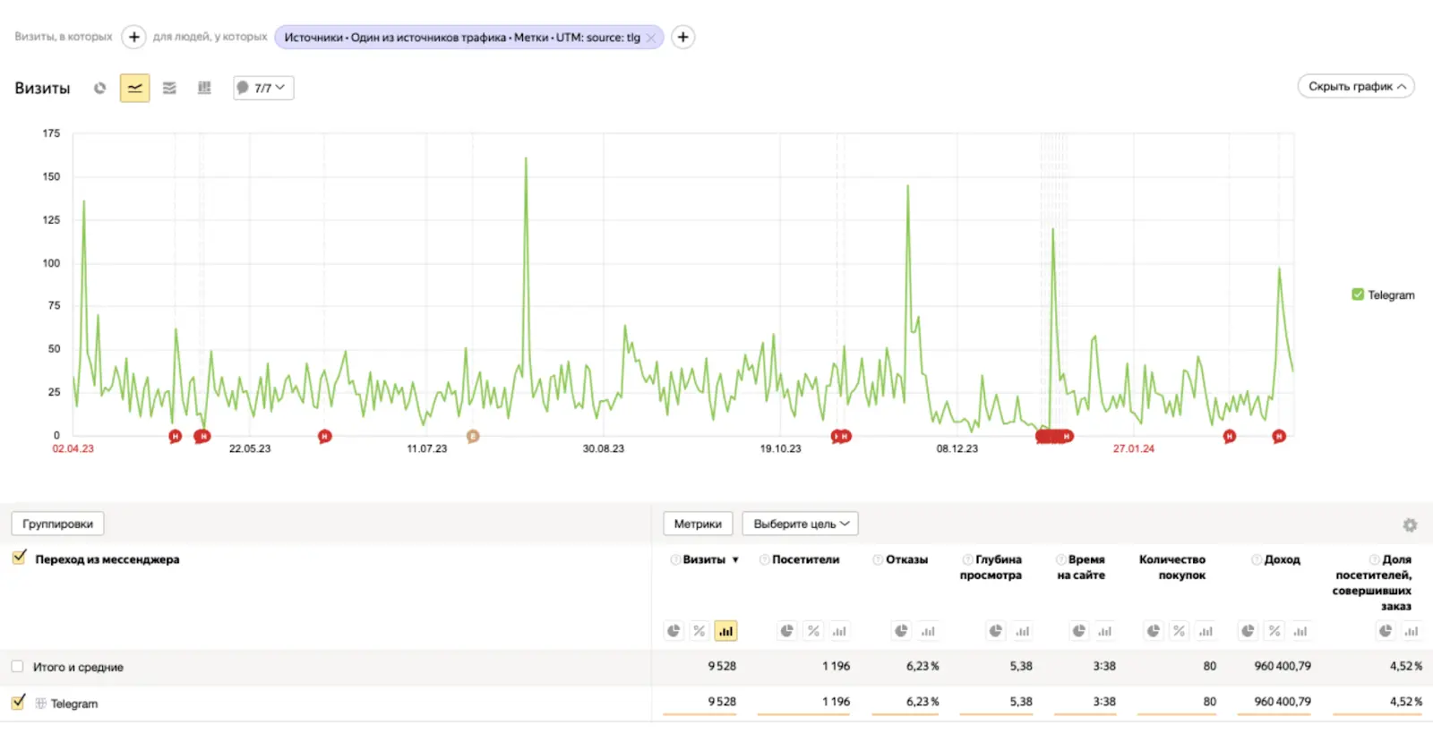 Клиент ранее не запускал рекламу в TG Ads, но активно вел свой телеграм-канал. Основной рекламный трафик — с рекламы в Яндекс Директе, через инфлюенсеров и в ВК. У нас была статистика по рекламному трафику, поэтому первоначально проанализировали метрику клиента.