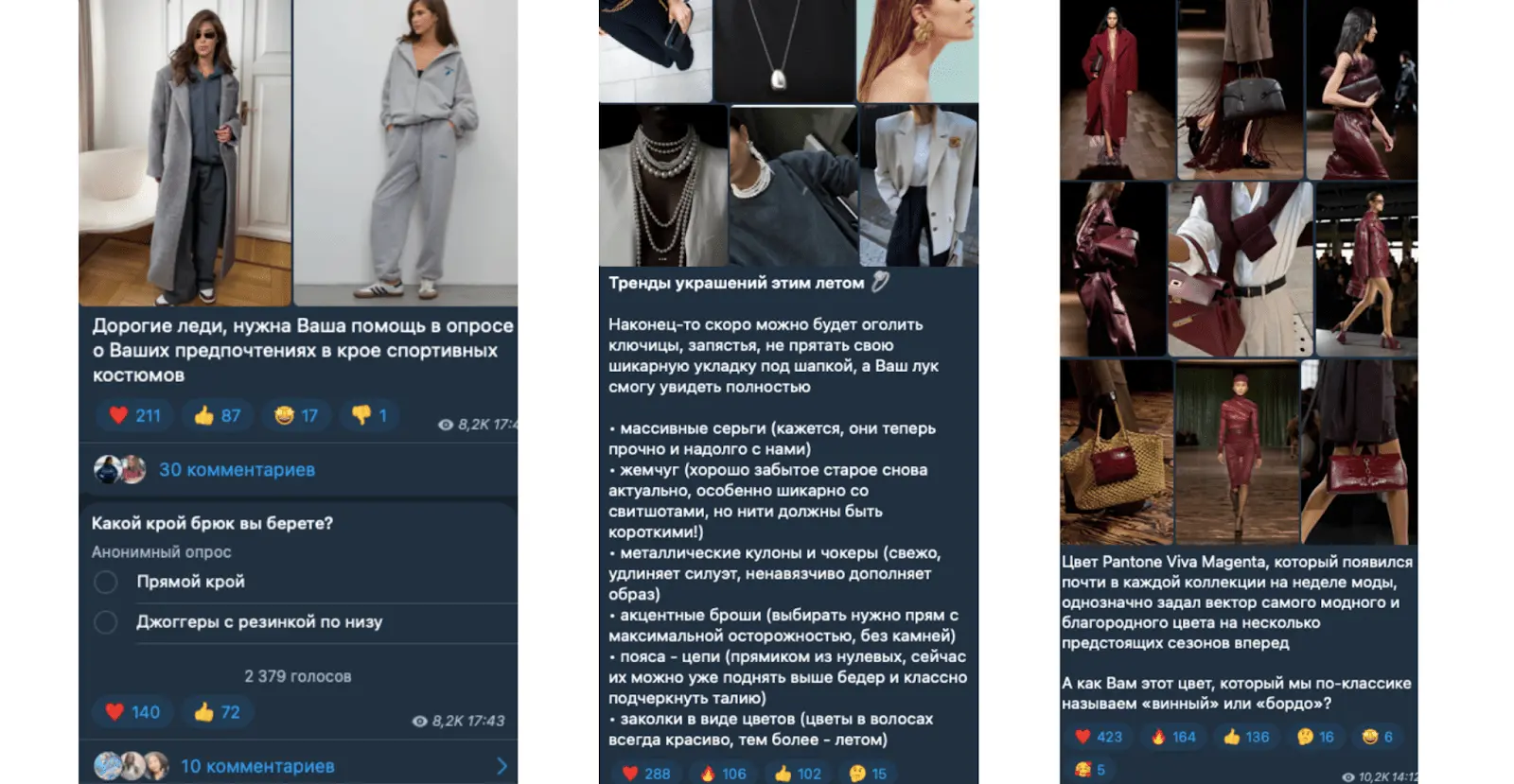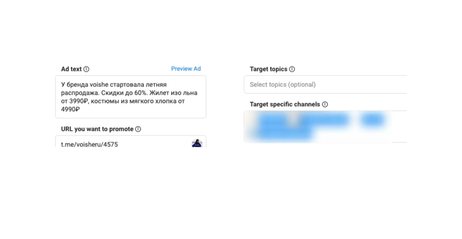 Мы имели дело с уже развитым и активным каналом Voishe. Запрос был на то, чтобы увеличить количество заявок при сохранении цены. Такие показатели мы имеем спустя год работы. Важный момент: это заказы с телеграм-канала, но без UTM-меток. Теперь покажем, сколько заявок получили по ссылкам в постах с нашими UTM-метками: Мы получили за год плюсом 80 покупок по цене в среднем до 3500 руб. Подписки также значительно приросли, при этом нам удалось перекрывать отписки и удерживать оптимальную цену за подписчика — а именно до 1,2 евро. Количество подписчиков на канале до начала работ: Количество подписчиков спустя год работы с нами: Конечно, в приросте на 14,6 тысяч подписчиков не только наша заслуга, этому способствовало и ведение телеграм-канала — об этом расскажем чуть позже. Работу можно разделить на следующие этапы: При подборе аудиторий использовали сервис TGstat, чтобы сразу оценивать каналы по активности, контенту и вовлеченности. Здесь мы брали в расчет меньше параметров, чем обычно, когда выбираем каналы для посевов, так как реагировать на рекламу будет живая аудитория, а не боты. Какие аудитории для запусков выбрали: В первую очередь решили начать с самого очевидного: конкурентов и стилистов. По нашему опыту, объявления в начале запуска не сразу набирают хорошие обороты, но не в этом случае. Уже с первыми запусками мы получали оптимальный CTR и цену подписки — в среднем 1,2 евро. Запускаемые сборки не тестировали на других проектах, решили начать с чистого листа, чтобы непредвзято оценивать каналы и запуски. Первые объявления привлекали подписки по оптимальной цене. Аудитории, которые перегорали, мы перезапускали снова, но с другим текстом — касается успешных по цене подписки или по высокому CTR. По аудиториям с начала старта хорошо отрабатывали себя каналы из среднего сегмента и каналы стилистов, на них и сделали далее основной упор. Для сбора и анализа аудиторий в социальных сетях рекомендуем использовать сервис Pepper.Ninja. С его помощью можно подобрать аудитории для точечного таргета в ВК, узнать интересы ЦА, проанализировать креативы конкурентов и многое другое. Как можно заметить, текст составляли под tone of voice канала — лаконично, с упором на комфорт и женственность коллекций. Также отслеживали, чтобы наши объявления подходили под каналы, на которых показываемся, то есть рекламировали коллекцию из льна на каналах брендов, специализирующихся как раз на льне. Преимущественно тексты делились на следующие категории: Наилучшие результаты мы получали с текстов на подписку и покупку. Позже стали тестировать текст с цифрами — он также хорошо себя показал по цене подписки. Когда у нас уже были успешные сборки и аудитории, мы углубились в оптимизацию и анализ трафика. По каким метрикам оптимизировали кабинет: Некоторые из метрик стали доступны не сразу (обновление вышло позже), поэтому считали их через таблицу с выведенными формулами. Заказы считали через подключенную метрику и UTM-метки в ссылках в постах и объявлениях. Важное примечание: нельзя точно отследить, была ли заявка с канала от приведенного нами подписчика — у TG Ads пока нет такой аналитики. Но благодаря UTM в ссылках на сайт в объявлениях мы могли точно понять, что заявка наша. Оптимизировали аудитории несколько раз в день: утром, перед обедом и вечером. Проходились по всем запущенным аудитори