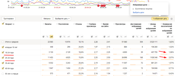 На скриншоте видно, что по категории возраста 18-24 конверсия в заказ в два раза ниже чем у 25-34. Распределив бюджет на более конверсионную категорию возраста вы повысите конверсию в заказ и как следствие снизите его стоимость.