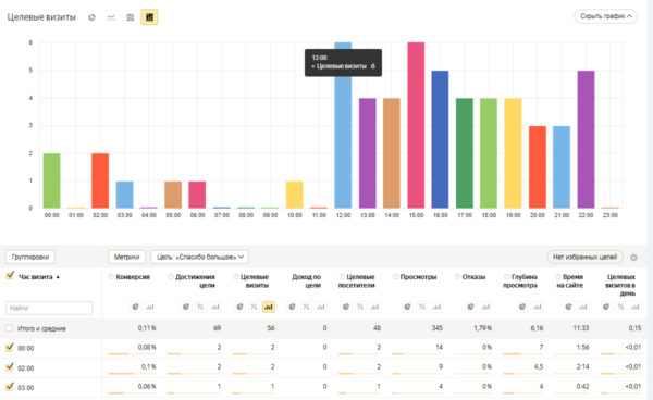 Использование около-целевых запросов которые не напрямую связаны с основным продуктом или услугой, но потенциально могут быть интересны целевой аудитории. Эти запросы помогают привлечь пользователей, которые находятся на стадии исследования или формирования интереса к продукту или услуге, и могут в итоге стать клиентами. Пример около-целевых запросов: Как их можно применить на практике? В кейсе с продвижением оптовых поставок брендовой европейской одежды эта категория запросов позволила привлечь лида по низкой стоимости и уже по итогам первого месяца перевыполнить согласованный с клиентом медийный план, цена заявки по итогам месяца вышла в 1,5 раза ниже ожидаемой. Например использовались запросы связанные с поисковом выставок оптовой продукции в Fashion сегменте — это оказалось аудитория с высокой конверсией в заказ. За каждым пользователем в сети остается информационный след — данные о поведении пользователей на основе их поисковых запросов, посещенных сайтов, просмотренного контента и взаимодействия с рекламными объявлениями. Эти данные используются для создания профилей интересов. Таргетинг по интересам — это метод настройки рекламных кампаний, при котором объявления показываются пользователям, исходя из их интересов и поведенческих данных, собранных Яндексом. Этот тип таргетинга позволяет более точно нацеливать рекламу на аудиторию, которая с большей вероятностью будет заинтересована в предложении, что повышает эффективность рекламных кампаний. Отчет метрики по интересам пользователей посещающих сайт. Анализируя такой отчет можно находить интересы наиболее релевантные вашей целевой аудитории тем самым повышая % конверсии в заказ. Мы рекомендуем обращать внимание на такие метрики как: время на сайте, аффинити-индекс и конверсия по цели покупка. Анализ активности аудитории: Определение наиболее эффективного времени для показа объявлений на основе анализа активности пользователей позволяет увеличить конверсии. Например, настройка показа рекламы в часы пик, когда аудитория наиболее активна, может значительно повысить её эффективность. Отчет метрики по времени посещаемости Такая статистика дает возможность определить часы в которых ваша целевая аудитория наиболее активна, что в итоге позволяет вам настроить часы показа рекламных объявлений. Показы рекламы в часы в которых ваша целевая аудитория наиболее активна позволяет повысить конверсию в заказ и как следствие снизить стоимость заявки. Создание персонализированных креативов: Адаптация рекламных объявлений под конкретные сегменты аудитории увеличивает их релевантность и вероятность конверсии. Если рекламируется сотрудничество в креативах важно, чтобы человек сразу понимал, что предлагается сотрудничество. Допустим это оптовые поставки женской одежды — в таком случае важно было при помощи визуала и заголовка дать на это акцент — показать товар в количестве, а в заголовке ясно дать понять, что речь идет про оптовых поставки. Объявлении, должно на 100% отражать реальность на посадочной странице и быть привлекательным. Не менее важный момент — это A/B тесты и оптимизация креативов которые помогают повысить эффективность рекламных кампаний за счет выявления наиболее привлекательных элементов объявлений и улучшения пользовательского опыта.