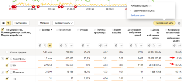 На скриншоте видно, что конверсия с мобильного устройства гораздо ниже чем на ПК. В таком случае мы рекомендуем проверить мобильное приложение на его юзабилити или протестировать гипотезу в рекламной кампании которой будет исключены пользователи мобильных устройств.