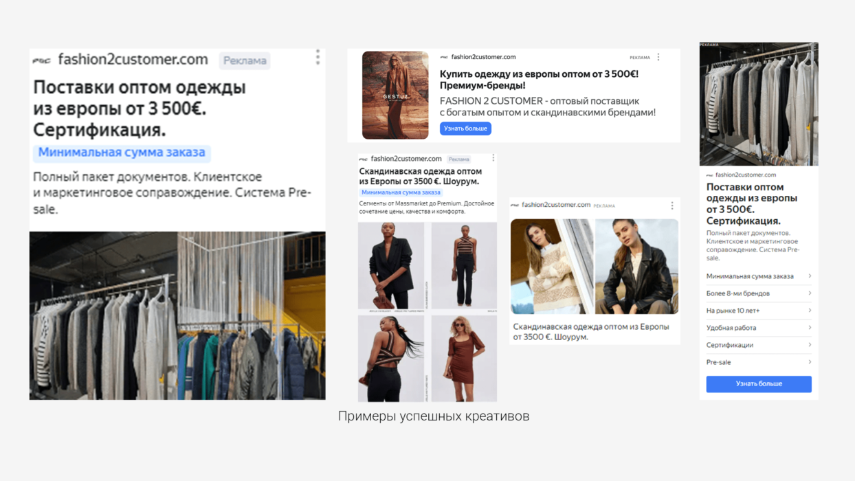 - Продвижение брендовой европейской одежды;В статье Контекст для B2B: 100 заявок на оптовые поставки брендовой европейской одежды в первые 2 месяца работырассказывается о методах привлечения оптовых клиентов на рынке модной одежды. Таргетированная реклама помогла добиться высокой конверсии и увеличить количество заявок на поставки за счет использования аудиторий по интересам и около-целевым запросам.