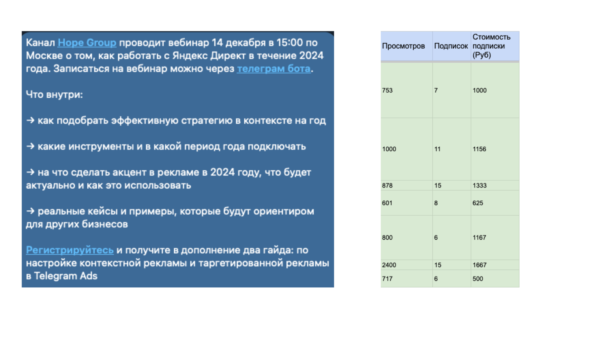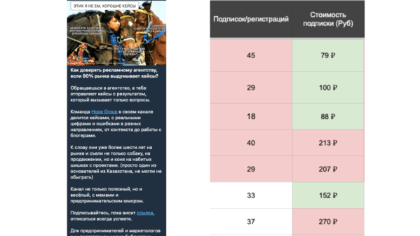 Реклама проходит через тематические каналы или блогеров, в виде поста с картинками или без. В данном формате рекламы нельзя предугадать успешность кампании, необходимы регулярные тесты и проверки гипотез. Очень важен тщательный анализ канала на котором планируется размещение. Пример посевов в нельзяграме Посевы на Youtube Такая реклама обычно проходит через интеграции и благодаря спонсорам, и размещается в роликах блогеров. Рекламе посвящается конкретный тайминг, в течении которого блогер озвучивает рекламный текст и призывает обратить внимание на бренд. Пример посевов в YouTube Посевы в Telegram Реклама проходит через тематические каналы или блогеров, в виде поста с картинками или без. В данном формате рекламы нельзя предугадать успешность кампании, необходимы регулярные тесты и проверки гипотез. Очень важен тщательный анализ канала на котором планируется размещение. Пример посевов с целью регистрации на вебинар Нативный посев Реклама, которые не выглядит как реклама. Она эффективно себя показывает, но сложна в создании. Такая реклама зачастую становится вирусной, и не содержит себе прямом намека на продажу. Каждый вид посева конечно должен сопровождаться грамотно продуманной продающей воронкой, вести к определенному посту, товару, услуге. И каждый посев также нуждается в анализе эффективности и оптимизации, и тут я расскажу подробнее. Как и в обычной онлайн-рекламе, есть определенные показатели и метрики, по которым можно оценить эффективность рекламы: Каждый из показателей важно контролировать и отслеживать, а далее оптимизировать и улучшать показатели. Но как это сделать? Отслеживаем результаты на протяжении всего рекламного времени. Когда рекламное время подходит к концу, все результаты мы записываем в отчетную таблицу, в которой уже сводим данные. Показы, реакции, переходы — можно узнать по статистике рекламного поста/истории/рилса и т.д. Такие метрики как «количество конверсий» можно заметить благодаря расставленным в ссылках UTM-метках, далее уже переходим в Метрику, и сводим конверсии. CPM — определяется по формуле: Стоимость рекламы / Количество показов * 1000. CPA — Затраты на рекламу / количество совершенных целевых действий. CPL — Затраты на рекламу / Количество привлеченных лидов. Благодаря подсчетам необходимых метрик через формулы в отчетных таблицах, результаты считаются автоматически. Нужна помощь в отборе каналов для посевов? Обращайтесь ко мне за бесплатной консультацией вTelegram. Далее расскажу о способах повышения показателей эффективности и оптимизации. 1. Анализ — анализируйте результаты рекламных кампаний, измеряйте показатели и отслеживайте улучшаются ли они. Если показатели стоят на том же месте — вероятно, вы либо показываетесь не совсем целевой аудитории, либо стоит переработать рекламный текст и подачу. 2. Тесты — тестируйте различные направления блогов и каналов, даже самые неочевидные, но те, что связаны с тематикой вашего бренда. Проанализируйте интересы своей целевой аудитории, и исходя из этого определите косвенные интересы, которые также тестируйте в рекламе. Тестовые запуски на новые направления начинайте с небольших каналов. 3. Оптимизация бюджета — перераспределяйте бюджет в сторону тех направлений каналов и блогов, которые дают лучшие результаты. Такая оптимизация бюджета будет поле