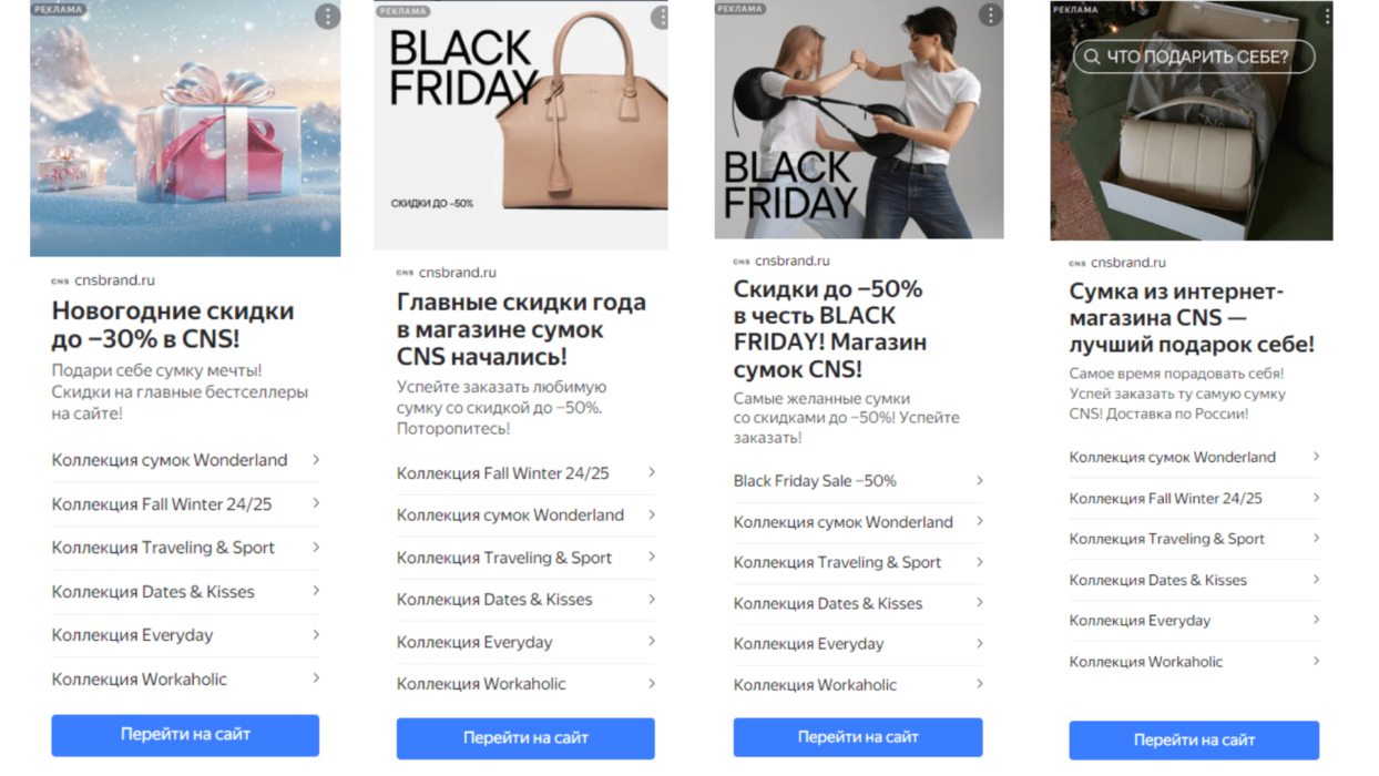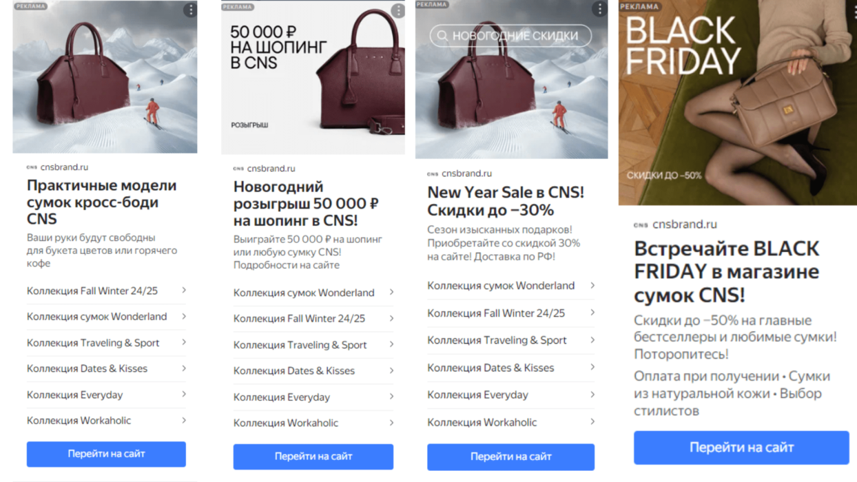 Примеры успешных объявлений: Для распродажи использовали офферы со скидкой до 50% на Ваши любимые модели сумок, 100% натуральная кожа, и скидки на главные бестселлеры бренда. Тестировали различные аудитории Результаты за август-октябрь В августе справились с задачей продвижения распродажи летней распродажи.В сентябре получилось масштабироваться, а также получилось удержать стоимость заказа и ДРР в целевых значениях. В октябре удалось еще больше масштабировать рекламный бюджет, и получилось снизить стоимость заказа и ДРР, по сравнению с августом-сентябрем. В сентябре ДРР повысился по сравнению с августом на 2,5% в связи с тем, что вышла новая коллекция и закончилась распродажа, прогревали аудиторию новой коллекции, тестировали новые аудитории, чтобы в октябре-ноябре повысились продажи. ВАЖНО! Если бы не регулярная оптимизация и генерация новых гипотез — результат может просаживаться еще хуже (вплоть до ДРР в 70%). В октябре ДРР снизился по сравнению с сентябрем на 13%, на это повлияло: Успешные аудитории (лучше всего отработали): Тоже хотите, чтобы продажи вашего бренда увеличились в несколько раз? Запишитесь на аудит у нашего специалиста: мы изучим проект, разберем возможные стратегии и вернемся с прогнозом развития вашего проекта В ноябре делали упор на продажу осенне-зимней коллекции сумок, прогрев аудитории к акции Черная пятница, масштабирование рекламного бюджета при положительной динамике заявок. В декабре поставили план удержать показатели ноября, продвижение акций и офферов «порадуй себя подарком на новый год», «новогодний розыгрыш 50 тыс. руб.», «New Year Sale», упор на продвижение осенне-зимней коллекции сумок В январе целью было удержать цену заявки не хуже предыдущих двух месяцев, понимали что после Нового года возможна просадка на праздниках, делали упор на осенне-зимнюю коллекцию сумок, больше работа с ретаргетом, аккуратная работа с холодной аудиторией. В период распродажи использовали офферы про «скидки до 30% на Ваши любимые модели сумок», «розыгрыш сертификата на 50 тыс. руб. при покупке сумок», а также «выбери себе подарок на Новый год». Немного успешных объявлений Тестировали различные аудитории в рекламном кабинете: Результаты ноябрь-январь: В ноябре справились с задачей масштабирования рекламного бюджета по сравнению с октябрем на 172 624 руб., при этом увеличив выручку, количество продаж и заказов, снизив цену заявки и ДРР.В декабре получилось улучшить результаты по сравнению с предыдущем месяцем, также, получилось удержать стоимость заказа и ДРР в целевых значениях, при этом увеличив выручку и количество заказов, продаж. За период с 1 по 25 января получилось получилось удержать стоимость заказа и ДРР в целевых значениях с учетом новогодних праздников без просадки. На улучшение результатов в период ноябрь-январь по сравнению с периодом август-октябрь повлияло: Успешные аудитории: Вот пример: Работайте с брендовыми запросами, у нас договоренность с заказчиком, траты на брендовую кампанию не более 30%. Многие компании считают, что не нужно работать с брендовыми запросами, так как бренд и так известен и люди будут покупать. Но многие не учитывают, что брендовые запросы могут выкупать ваши конкуренты, а также можете вы выкупать брендовые запросы конкурентов. Вот пример: В 2025 для снижения зависимости от сезонности спро