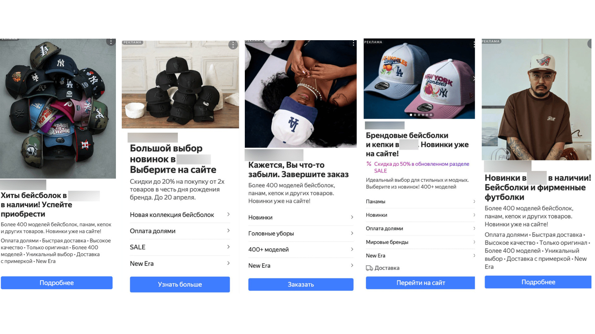 - РСЯ: кампании по ключевым запросам: «купить бейсболку», «купить кепку», «брендовые бейсболки купить»;