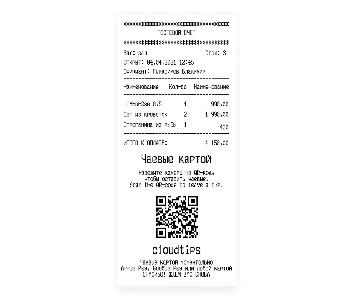 Если вам выдали чек без такого кода, возможно, это не чек, а предварительный расчетный документ, например, как счет в ресторане. Однако в ресторанном счете может быть QR-код для оплаты чаевых. Такой тип QR-кодов легко отличить по меткам «оплата чаевых», «чаевые картой» или «безналичные чаевые».