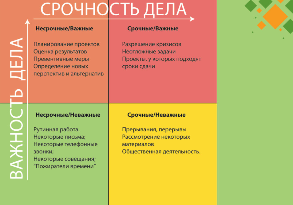 2. Старайтесь организовать свою жизнь и работу так, чтобы было как можно меньше дел срочных и важных, так называемых пожаров. Они занимают массу времени и нервов, отвлекают от других дел и обычно случаются из-за неправильного планирования.