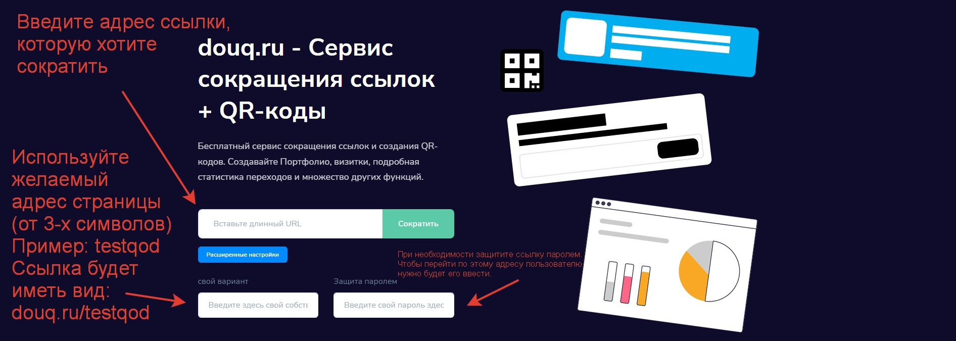 Сокращение ссылок без регистрации: Одно из главных преимуществ нашего сервиса — доступность его функционала без необходимости регистрации. Мы ценим ваше время и делаем наш сервис максимально удобным и быстрым. Теперь вы можете сокращать ссылки без лишних формальностей и задержек. Оверлеи с призывами к действию: Наш сервис также предоставляет возможность добавлять оверлеи — контакты с призывами к действию, опросы для получения откликов, формы для сбора электронных адресов, изображения и купоны. Это позволяет улучшить взаимодействие с вашей аудиторией и максимально эффективно использовать каждую ссылку. Страницы в сети: Еще одна удобная функция — создание персональных страниц с короткими адресами всего из трех символов. На этих страницах вы можете размещать видео с YouTube, материалы WhatsApp, изображения и другие графические элементы. Это отличное решение для продвижения ваших услуг или продуктов. Защита и безопасность: Мы гарантируем безопасность нашего сервиса. Мы используем Virus Total API и собственные алгоритмы для обнаружения фишинговых ссылок. Наш сервис уже работает более года и имеет превосходную репутацию среди поисковых систем, таких как Yandex, Bing и Google. Заключение: Приглашаем вас посетить наш сайт douq.ru и ознакомиться с его полным функционалом. У вас теперь есть надежный инструмент для решения повседневных задач и оптимизации бизнес-процессов. Не упустите возможность поделиться преимуществами douq со своими коллегами и клиентами!