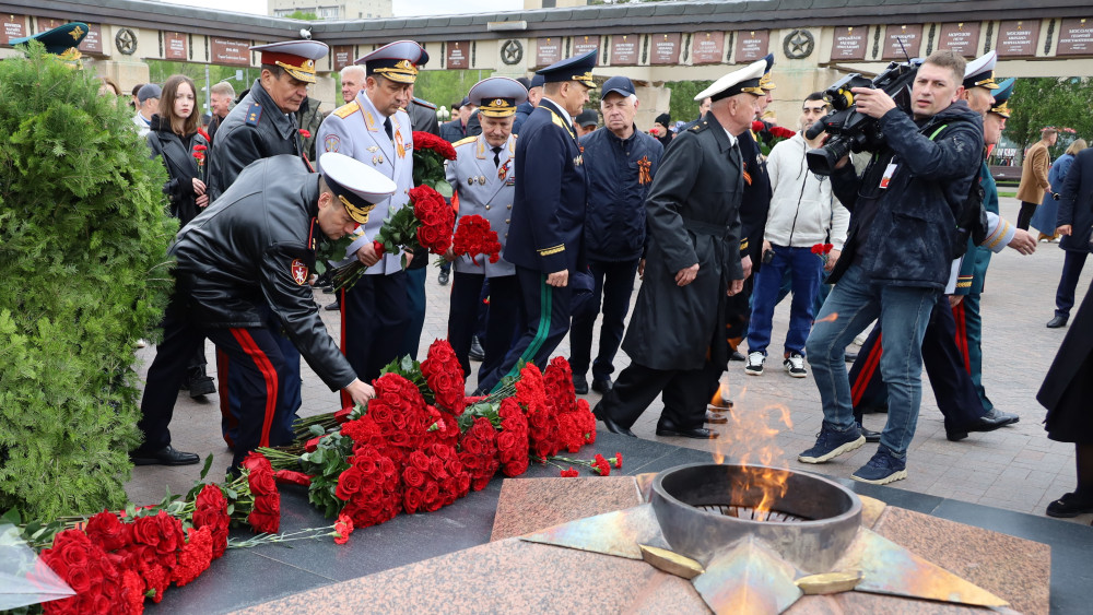 Участники церемонии почтили память павших в годы Великой Отечественной войны минутой молчания. После этого под звуки оркестра прошли по живому коридору и возложили цветы к Вечному огню, к подножиям Монумента Матерям и Вдовам погибших воинов и Монумента Советскому Солдату.