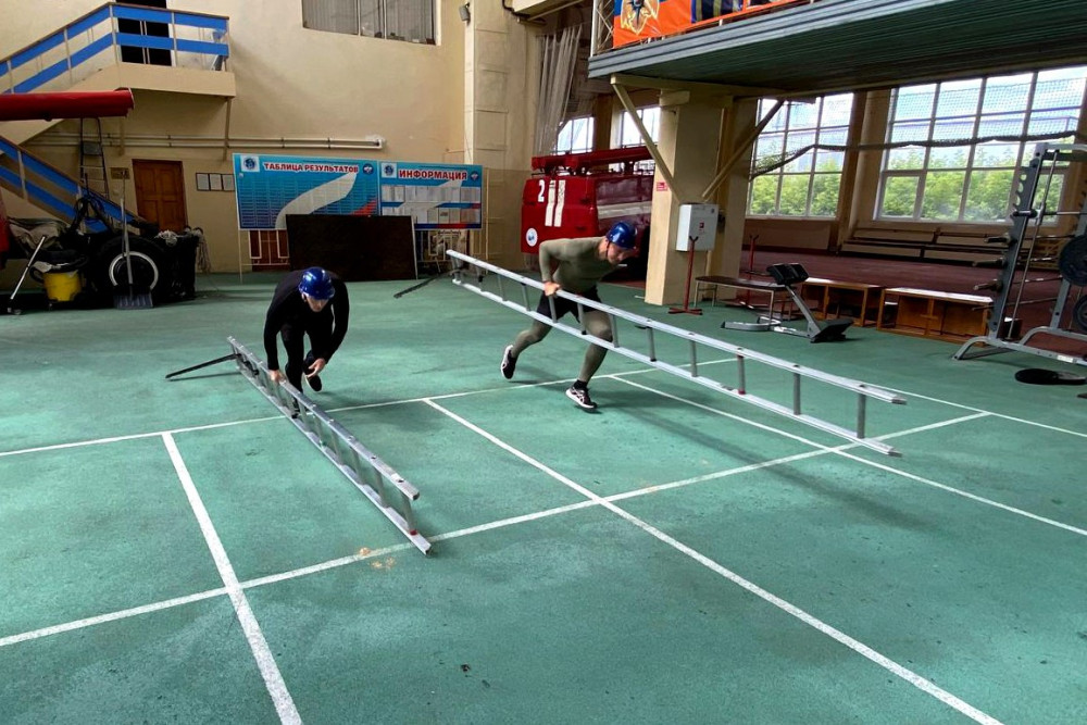 Военнослужащие и сотрудники соревновались в преодолении полосы препятствий и подъему по штурмовой лестнице в окно четвертого этажа учебной башни.