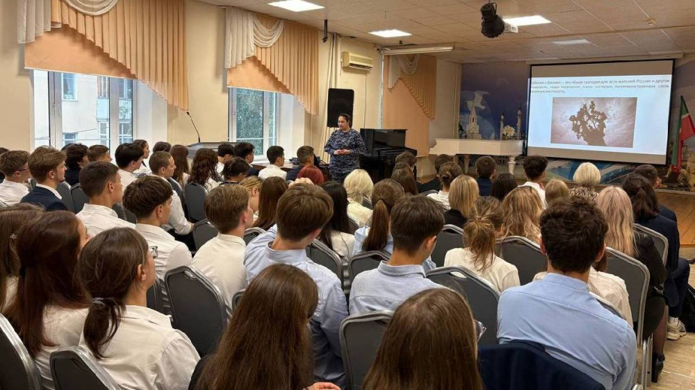 Представитель городского управления вневедомственной рассказала учащимся, почему экстремизм несёт угрозу всему обществу и о том, как с этим преступным проявлением борются военнослужащие и сотрудники ведомства. Росгвардеец напомнила о теракте 2004 года в Беслане, когда от рук террористов погибли 334 человека, 186 из которых — дети. Школьники посмотрели слайды, посвящённые памяти жертв террористических актов.