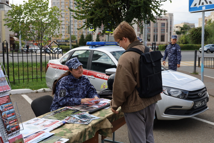 Работу агитационной бригады организовали на площадке у одного из крупных торговых центров города. Для граждан была развернута экспозиция с наглядными материалами. Все желающие могли получить информационные буклеты и пообщаться с представителями различных подразделений Росгвардии.