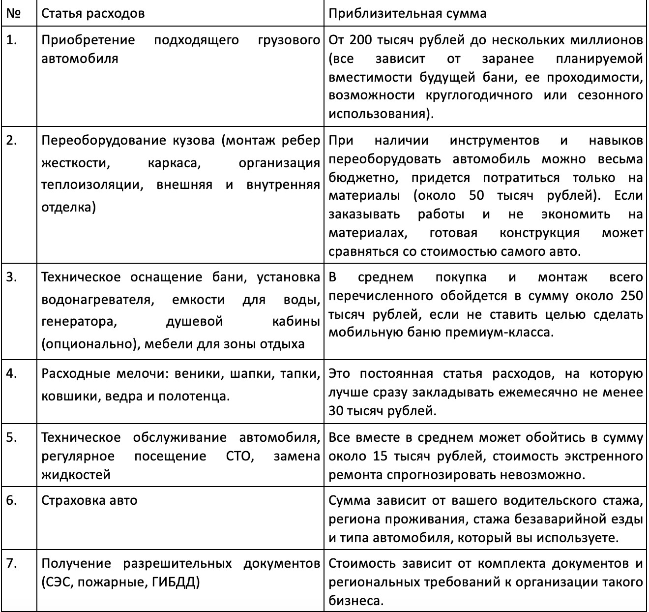Другое дело — бани мобильные или передвижные. За время пандемии мы все привыкли к доступности любых мобильных услуг. Доставка еды на дом, товаров с маркетплейсов, клиниг, косметология... Все это сегодня можно получить, не выходя из дома или офиса. А вот в баню до недавнего времени нужно было ехать самому. Однако и этот бизнес нашел возможность адаптироваться к современным реалиям. Так появились мобильные или передвижные бани. Согласитесь, гораздо удобнее совместить приятное с полезным и организовать отдых на своей собственной даче или в кемпинге. Это здорово экономит время, позволяя не отказывать себе в удовольствии попариться и помыться с комфортом. Именно поэтому услуга сразу стала пользоваться колоссальным успехом, а предлагающие ее владельцы «чудо-избушек на курьих ножках» начали зарабатывать чистыми до 100 тысяч рублей в месяц. Баней на колесах называют небольшой грузовой автомобиль с модернизированным кузовом или специально оборудованным прицепом. В кузове есть все необходимое: и небольшая парилка, и удобный предбанник. Самыми проверенными и надежными вариантами для организации мобильной бани можно назвать автомобили повышенной проходимости с высоким клиренсом: Главное, чтобы в кузове было достаточно места для двух обязательных зон: парной с печкой и предбанника, который можно совместить с душевой и раздевалкой. Лучше всего, если выделенного пространства будет хватать на компанию из 4-6 человек. Альтернативой может стать прицеп или рама-платформа, которые имеют довольно широкий ценовой диапазон. В прокатном деле, как и в любом другом бизнесе очень важно уметь планировать. Без этого быстро выйти на самоокупаемость, привлечь и удержать клиентов практически невозможно. Любой форс-мажор, любая неожиданность могут выбить из колеи и оставить арендодателя в буквальном смысле у разбитого корыта. Именно поэтому, до того, как решиться на вложения (а они в этом бизнесе, пусть и не сверхсолидные, но для простого человека довольно ощутимые), нужно составить четкий и грамотный бизнес-план. Что нужно будет учесть при его написании и на какие расходы обратить особое внимание? Список предполагаемых расходов на мобильную баню: Идея сдавать баню в аренду как бизнес, не нова. Среднегодовая рентабельность банного дела (как стационарного, так и мобильного с учетом колебаний спроса) составляет не менее 30%. Учитывайте это, прогнозируя прибыль и предварительно распределяя ее по необходимым статьям расходов. Даже такой простой, на первый взгляд, и понятный бизнес как аренда бани сопряжен с некоторыми рисками, которые стоит учесть еще на подготовительном этапе. Так причиной провала могут послужить: Важно! Мобильные бани могут эксплуатироваться только в статичном состоянии. Париться, мыться и даже просто сидеть внутри во время движения автомобиля категорически запрещено! Ценные советы начинающим арендодателям: Нужно сказать, что баня и стационарная, и мобильная — это доступный и комфортный отдых, который актуален круглый год. Но все же более активным спросом такая услуга пользуется именно зимой, когда хочется погреться, восстановить здоровье, вернуться в жаркое лето прямо из морозной реальности. Это, конечно, не значит, что летом в баню люди не ходят, но в жару больше привлекают открытые водоемы и бассейны, где можно охладиться и рассла