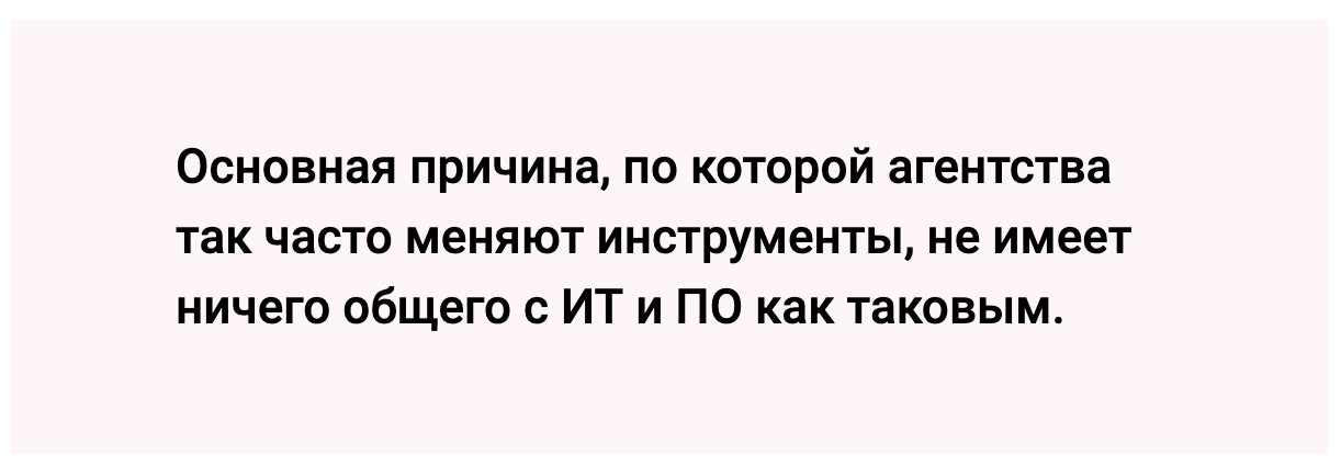 Соберите этот пазл вместе, и подходящий инструмент станет отличным ускорением и для вашего агентства. Игнорируйте эти строительные блоки, и скорее всего вы будете по-прежнему менять их каждые 2-3 года, гоняясь за очередным модным решением.