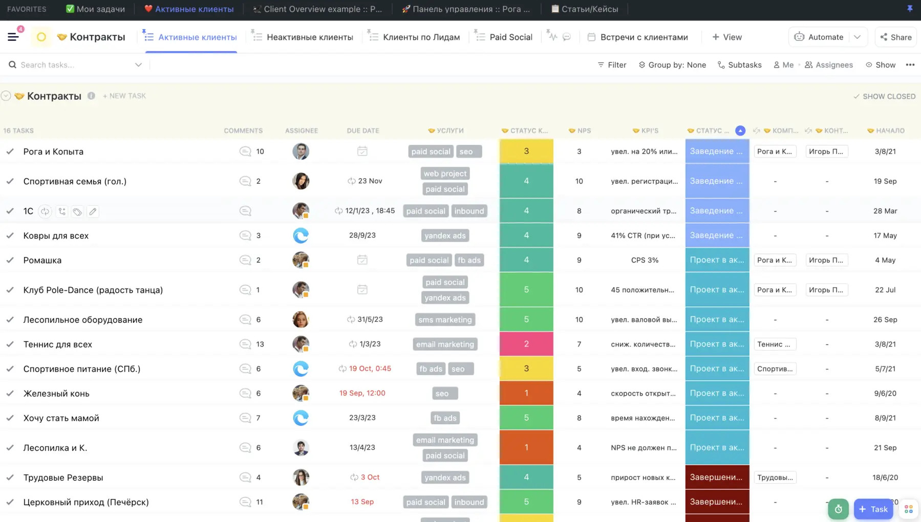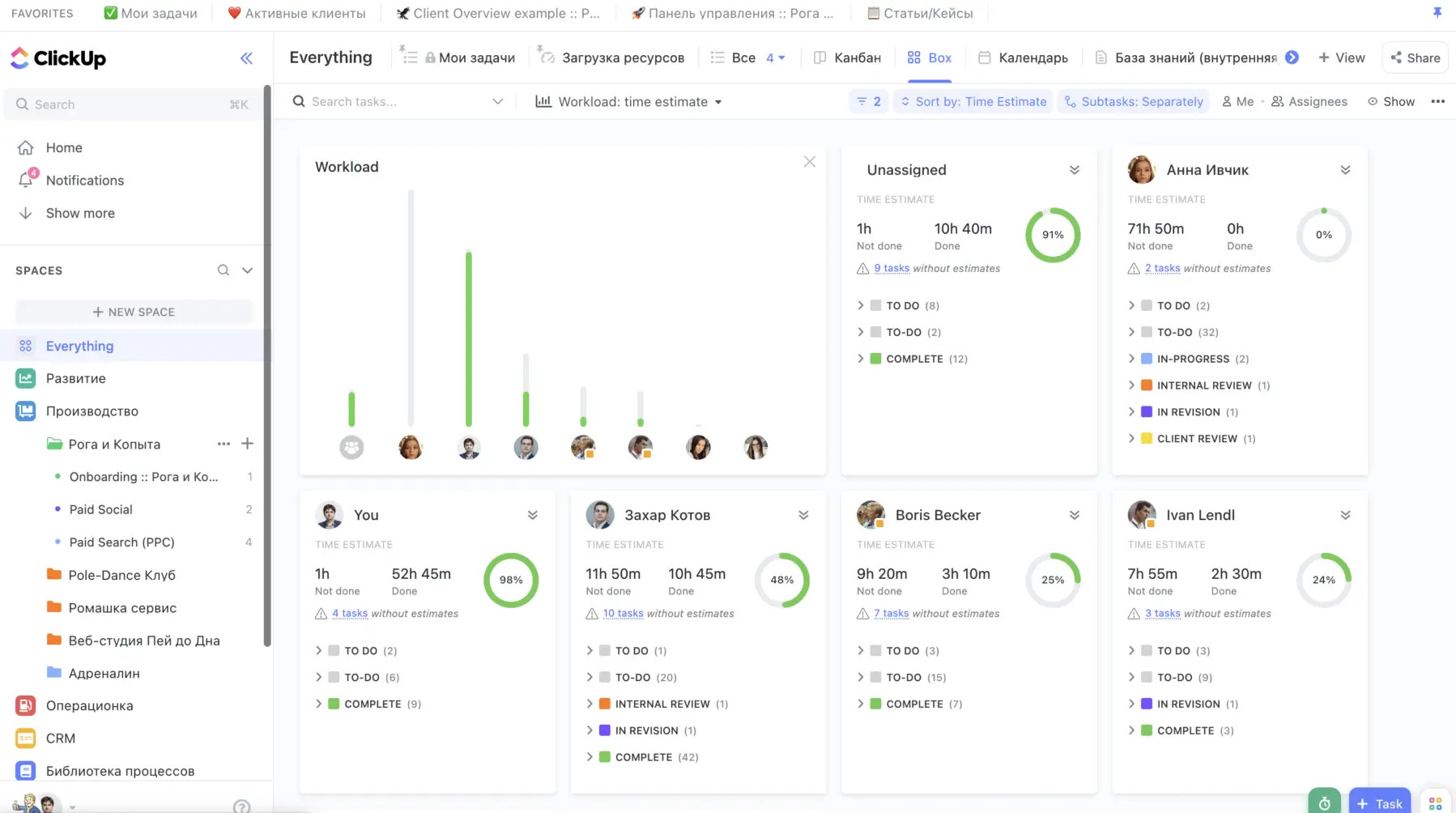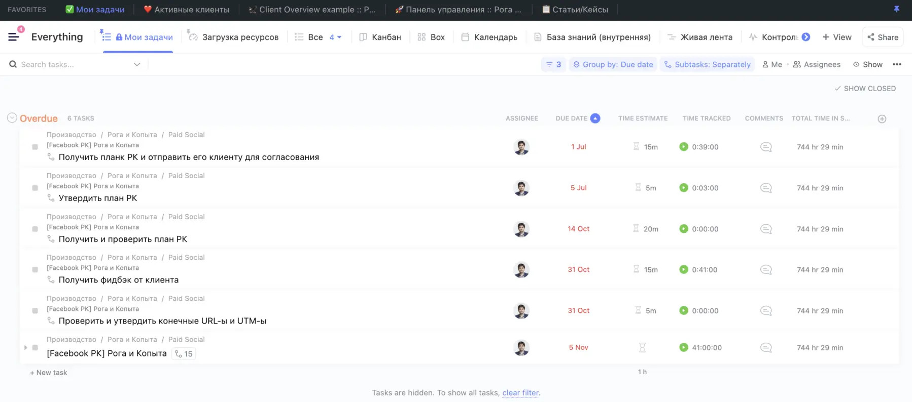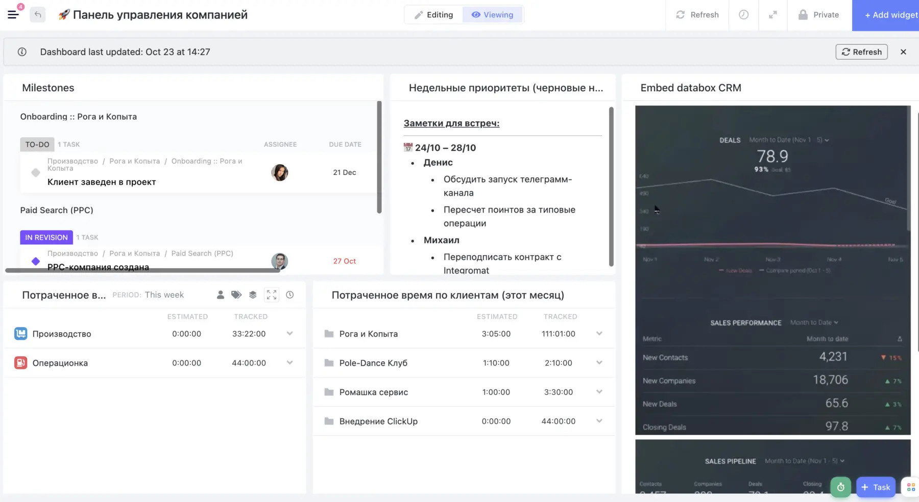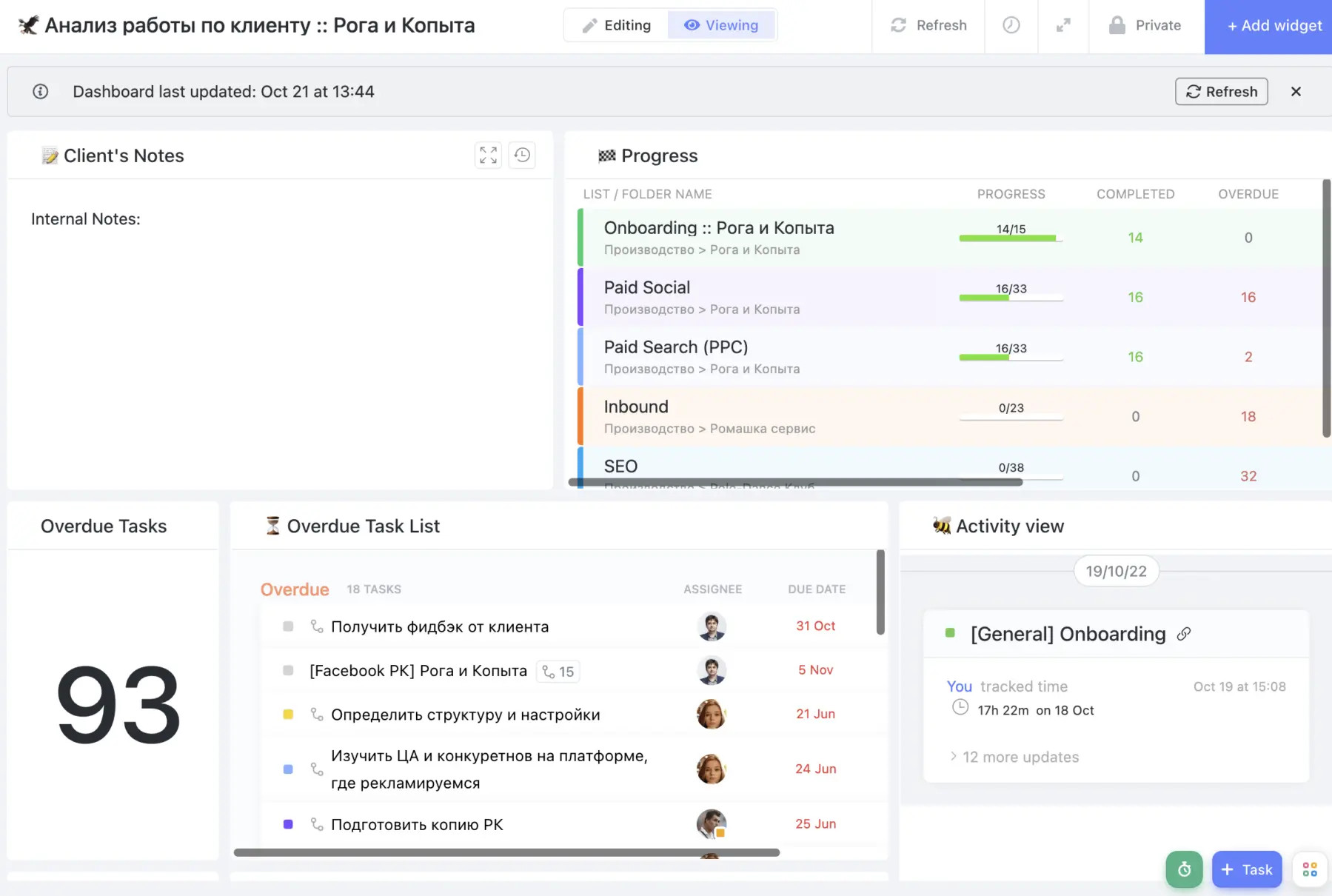 Чтобы иметь возможность всё обрабатывать, в агентском бизнесе, основанном на услугах, нужно иметь достаточно глубокий уровень иерархической структуры: ClickUp и Teamwork, были созданы с учетом этих потребностей. Другие инструменты (как Bitrix24 и Trello) были рождены для работы с конкретными проектами. Asana и Basecamp борются с одними и теми же проблемами более плоской иерархии. Например, в Bitrix24 можно насоздавать сколько угодно проектов (рабочих групп), но если нужно подняться выше и взглянуть на картину в целом, то... удачи. Звучит очевидно, верно? Большинство инструментов из топ-10 (список в конце статьи) справляются с этим без проблем (Notion будет единственным исключением, поскольку он был разработан как платформа для документации с массой возможностей базы данных, но это как раз и усложняет его использование для полноценного управления проектами). Нам нужен лёгкий и понятный способ назначать исполнителей, фиксировать сроки, управлять пользовательскими полями, приглашать наблюдателей, прикреплять файлы, отслеживать время, добавлять подзадачи + контекст, обсуждать задачу и т. д. — причем, как вручную, так и с помощью автоматизации или шаблонов. Также было бы полезно убедиться, что система поддерживает повторяющиеся задачи. ClickUp, Asana и Teamwork — все здесь блестяще, но Bitrix24 по этой позиции не дотягивает. Наконец, хотелось бы убедиться, что ПО поддерживает массовое редактирование задач. Включая смену исполнителей, если кто-то отсутствует, массовую установку значений настраиваемых полей, перемещение задач, изменение статусов и т. д.) Ваши сотрудники проведут здесь МНОГО времени (они практически будут жить здесь), поэтому интерфейс должен быть простым и понятным. Не секрет, что агентства получают существенный процент своей маржи от повторяющейся работы. Чтобы повысить её эффективность, следует искать: В этом случае ClickUp со своей гибкой и проработанной системой шаблонов делает всех как стоячих. Так, в Битрикс24 можно добавлять шаблоны задач (и в старших редакциях облачной версии даже иметь возможность скопировать Проект/Workspace), но ни о какой шаблонной иерархии пока речи не идёт. Агентству нужно три основных уровня анализа, с которых идёт управление проектом: Вот пример такого представления (ClickUp): Пример представления для аккаунта с группировкой по клиентам (ClickUp): В ClickUp такое предоставления для руководства агентства может выглядеть вот так: Данные также можно анализировать через панели управления ClickUp: Убедитесь, что ваш инструмент управления проектами может работать со всеми тремя уровнями, иначе вам будет сложно достичь полного внедрения в команде. Например, Битрикс24 может быть популярен в коммерческом отделе, но большинство участников проектной работы будут страдать (бывали случаи обострения неврозов и интенсификация обращения к психологам в попытке разобраться в своей кармический структуре и выяснить, за что на текущем витке перерождений жизнь их так наказывает). Basecamp и Trello отлично подходят для индивидуальных пользователей. Basecamp довольно хорош на уровне 2, но руководители агентств не получат там цельной картины. Monday отлично подходит как для Уровня 1, так и для уровня 2, но требует много настроек, чтобы правильно получить уровень 3. В других инструментах, таких как ClickUp, Asana и Teamwork, доступны отчеты для всех трех уровней, но нужно обратить внимание на нюан