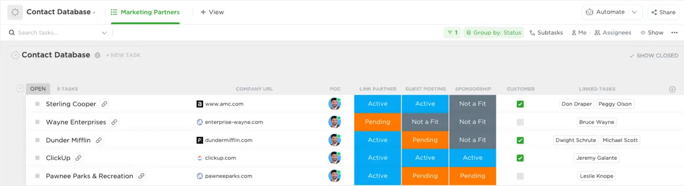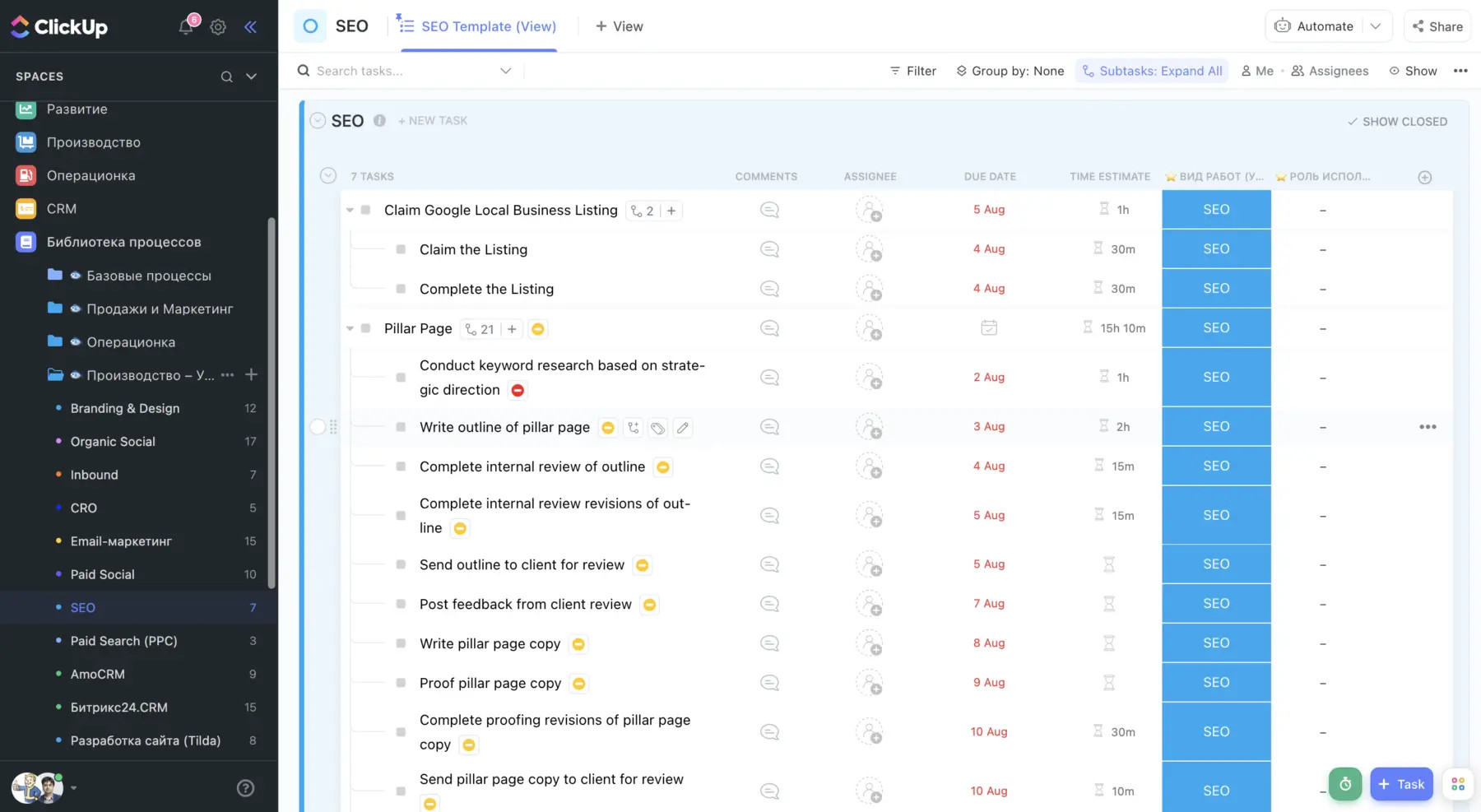 В мире SEO у нас есть инструменты для исследования ключевых слов, анализа контента, отслеживания позиций, аналитики и многого другого. Мы также часто используем электронные таблицы. И хотя эти инструменты никуда не денутся, они не идеальны для управления SEO-проектами. В электронных таблицах отсутствуют важные ключевые функции, такие как отслеживание времени, автоматизация и взаимосвязь между задачами. Кроме того, визуализации отчетов сложны и негибки. Пробовали ли вы создать временную шкалу проекта или Диаграмма Ганта в Excel? — задача не из приятных. Последнее, что нам нужно, — это ещё одна программа в нашем техническом стеке. Тем не менее современные инструменты для проектов созданы, и с их помощью можно решить многие из описанных проблем, объединяя при этом работу в одном месте. Количество совещаний увеличилось на 69,7%, а люди чувствуют себя более изолированными от своих коллег, поэтому самое время обновить свои способы и инструменты для управления работой. ✨ Программное обеспечение для управления проектами ✨ ПО для управления проектами, от простых списков дел до сложных и гибких рабочих процессов, предоставляет все функции, необходимые для организации задач SEO, совместной работы с командой и отслеживания кампаний. Эти инструменты также помогут при найме сотрудников. Разрабатывайте шаблоны задач onboarding’а новый клиентов, легко визуализируйте стандартные процедуры и создайте простой и понятный канал для общения с молодыми сотрудниками. Таким образом, вы сможете сосредоточиться на более важных задачах по созданию идеальной команды SEO. Существуют сотни инструментов управления проектами, но какой из них подходит именно вам? Верный ответ — это классическая фраза, с которой вы знакомы: «всё зависит от обстоятельств». Но прежде всего члены SEO-команды полагаются на кросс-функциональную работу. Наш совет — найти платформу управления проектами, которая лучше всего подходит не только вам, но и другим командам, с которыми вы взаимодействуете. Без всеобщей приверженности новые инструменты создадут новые препятствия и сведут на нет все свои эксплуатационные преимущества. Теперь о хорошем. Вот наши главные советы агентствам и командам, управляющим рабочим процессом с помощью ПО для управления проектами. Одна из первых вещей, которую мы обычно делаем, приступая к SEO нового веб-сайта, — это создание каталога. Это электронная таблица, в которой каждая страница сайта разбита на подпапки. Обычно мы импортируем эти данные из таких инструментов, как Ahrefs или Screaming Frog (оттуда достаются все необходимые атрибуты: URL, заголовок страницы, внутренние ссылки и т. д.) В этом есть множество преимуществ, например распознавание контента, о котором вы просто не знали. Таким образом мы не только улучшаем видимость для SEO-команды, но и помогаем другим членам маркетинговой команды получить электронную таблицу со всем контентом в одном месте. Но откуда мы знаем, что дальше происходит с этим контентом? Создание базы данных контента в инструменте управления проектами дает множество преимуществ. Он обеспечивает прозрачность работы, показывает исторические обновления и обеспечивает быстрый доступ к каждой странице. Когда вы начнете использовать автоматизацию и связи задач для стандартизации процессов, появится возможность находить всё новые способы оптим