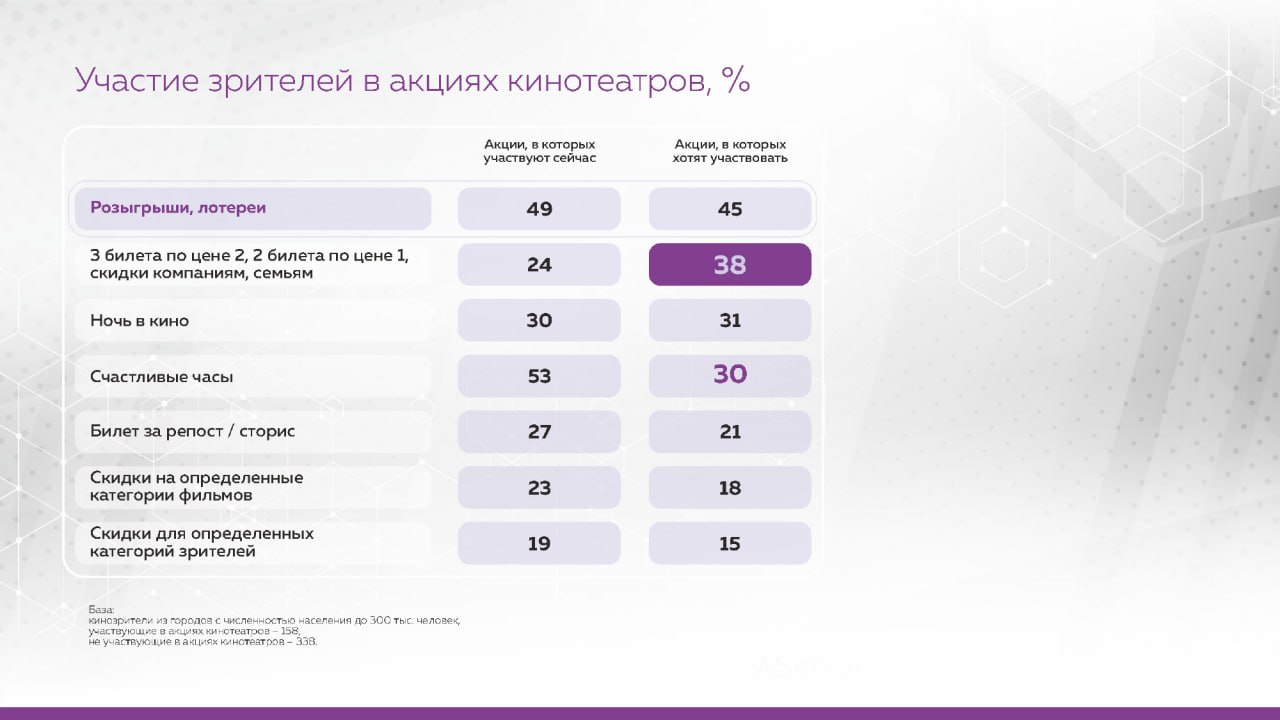 Аналитики выяснили, какой процент зрителей участвует или хочет участвовать в акциях кинотеатров, и какие это акции. Наиболее востребованные типы — розыгрыши и лотереи. Акции со снижением цены востребованы существенно меньше, что говорит о том, что кинозрителям важнее элемент геймификации, чем непосредственно скидка.