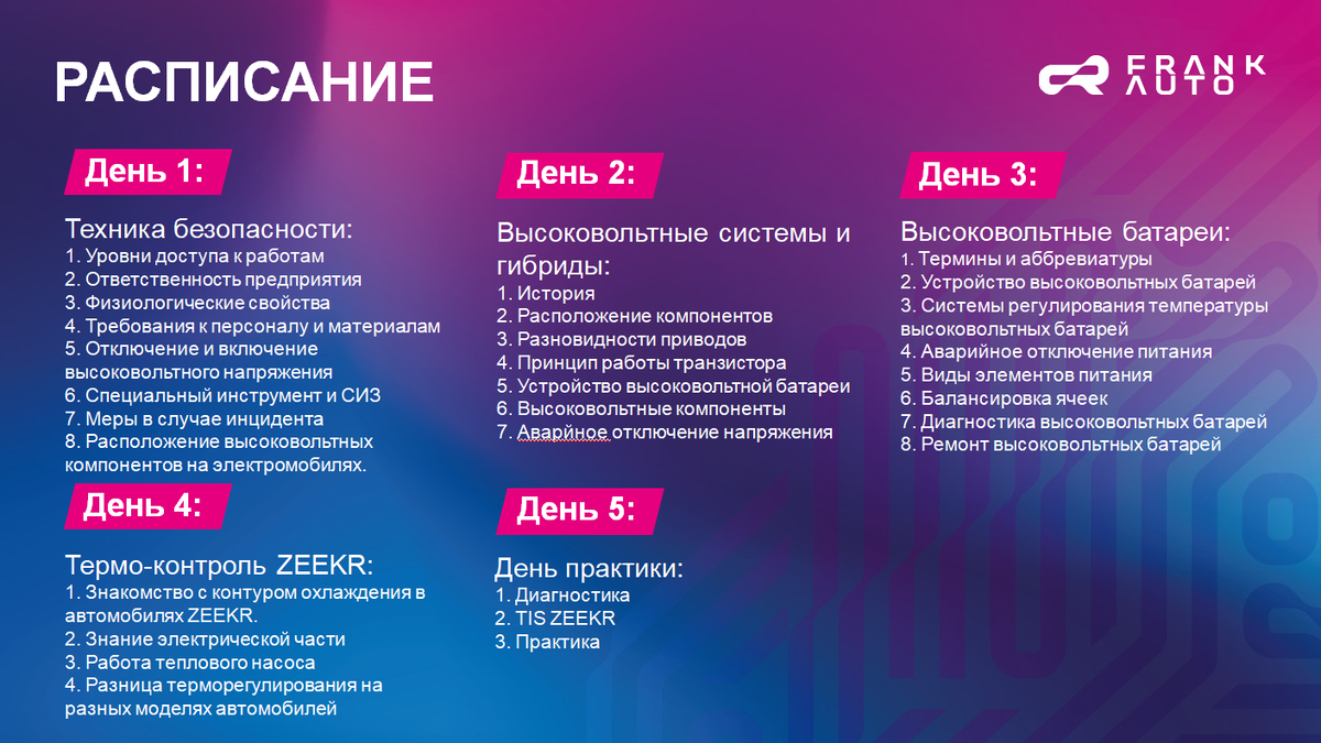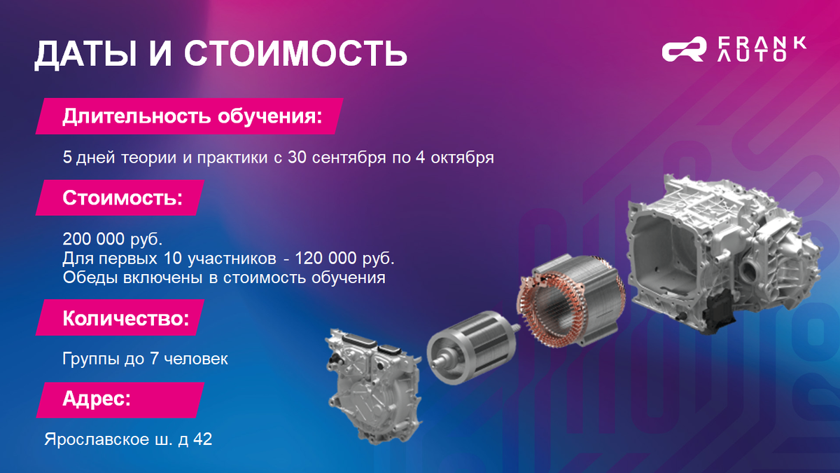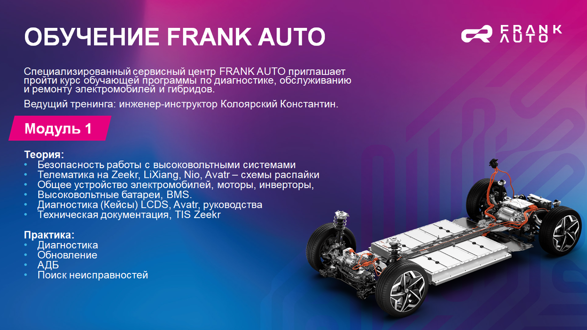 — Поэтому нам нужны надежные партнеры, которые смогут удовлетворить все запросы автовладельцев, связанные с русификацией, обновлением, мастер-аккаунтами, чтением ошибок и прочими нюансами. Обучающий курс пройдет с 30 сентября по 4 октября — участников ждет 5 дней теории и практики. При этом вы можете не только обучиться диагностике, обслуживанию и ремонту электромобилей в Москве, но и получить скидку на курс — для первых десяти участников обучение доступно с выгодой 80 000 рублей! Чтобы ознакомиться с программой обучения и стать партнером технической поддержки FRANK AUTO, обращайтесь к директору по развитию сервиса Денису Шайкину. FRANK AUTO RUSSIA — Новые автомобили в Москве с гарантией Тел.: +7 (499) 460—64—96 Подписывайтесь на наш Телеграм-канал: FRANKAUTO_RU Редакция PRslon