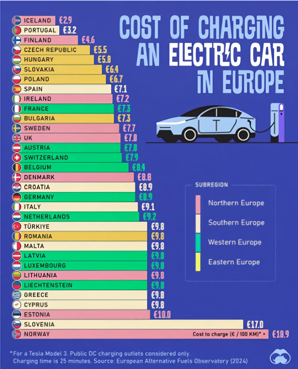 Как сообщили в EAFO, сведениями о ценах поделились операторы общественных станций быстрой зарядки, после чего была рассчитана средняя стоимость зарядки электрокара в Европе по каждому из государств ЕС. Расчеты производились на примере популярного электрокара Tesla Model 3.