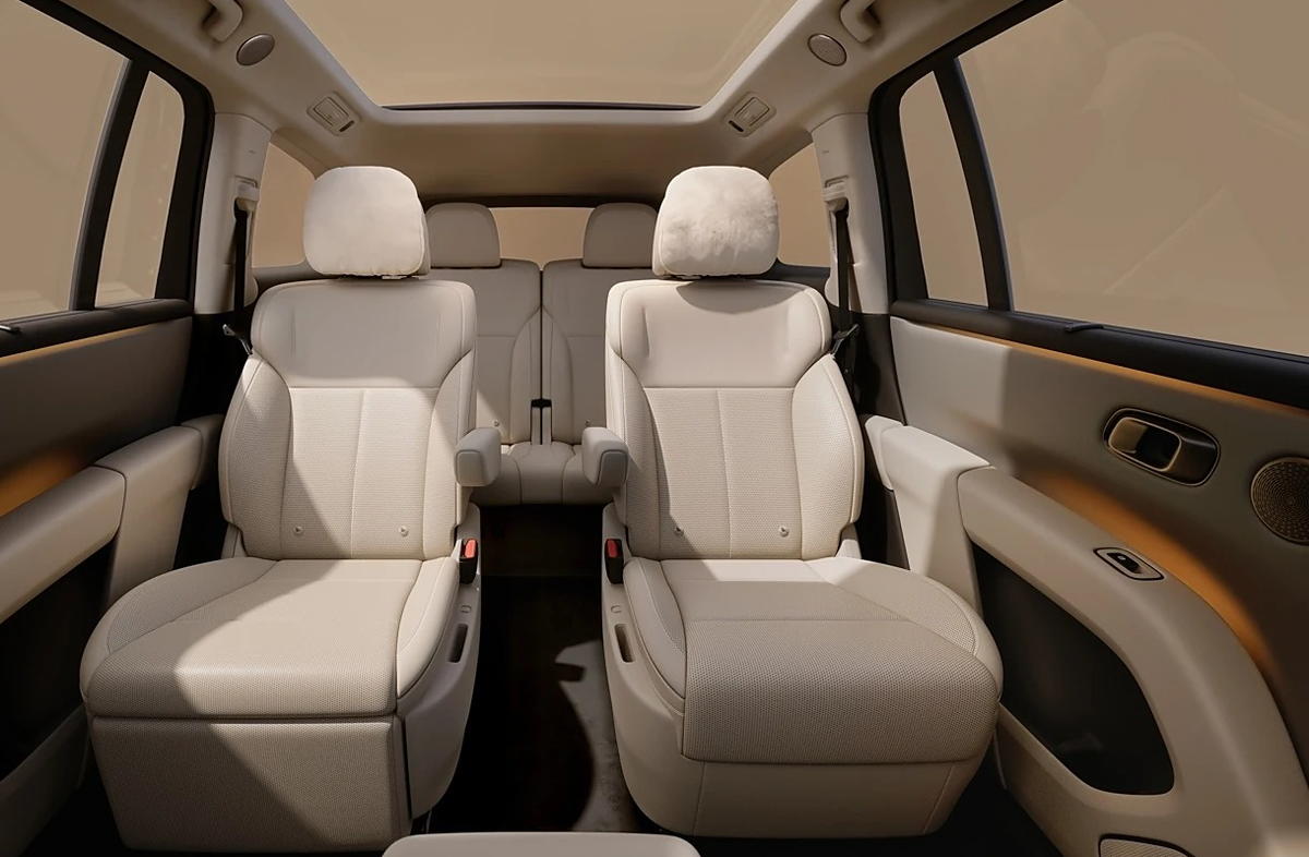 Салон оснащен классическим рулевым колесом с интегрированным дисплеем, кожаной обивкой дверных карт, двумя крупными экранами, системой проекционного дисплея (AR-HUD) и другими опциями. Особое внимание уделено комфорту второго ряда: одно из кресел получило продвинутый режим релаксации.