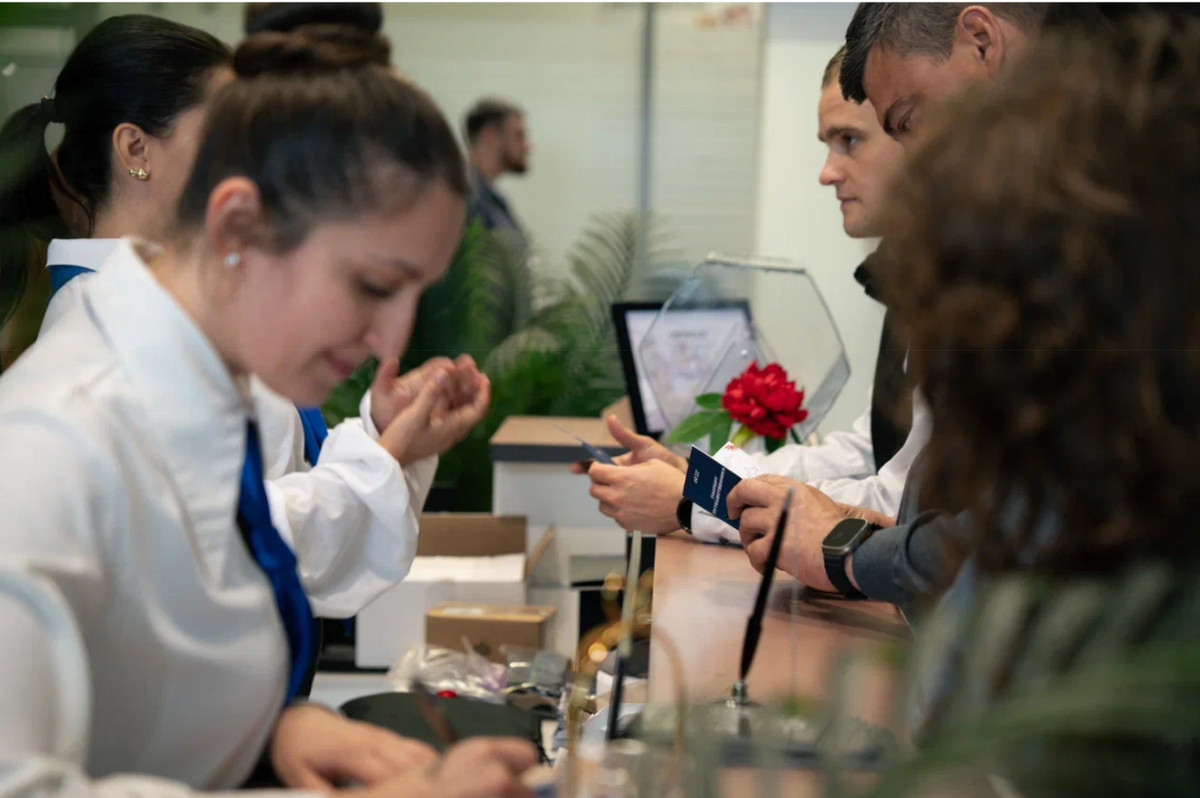 Уже на входе гости понимали, что их ждет нечто особенное. Вместо привычной регистрации их встречали хостес в форме стюардесс авиакомпании FRANK AUTO AIR, которые вручали каждому гостю «Паспорт путешественника» и «Посадочный талон».