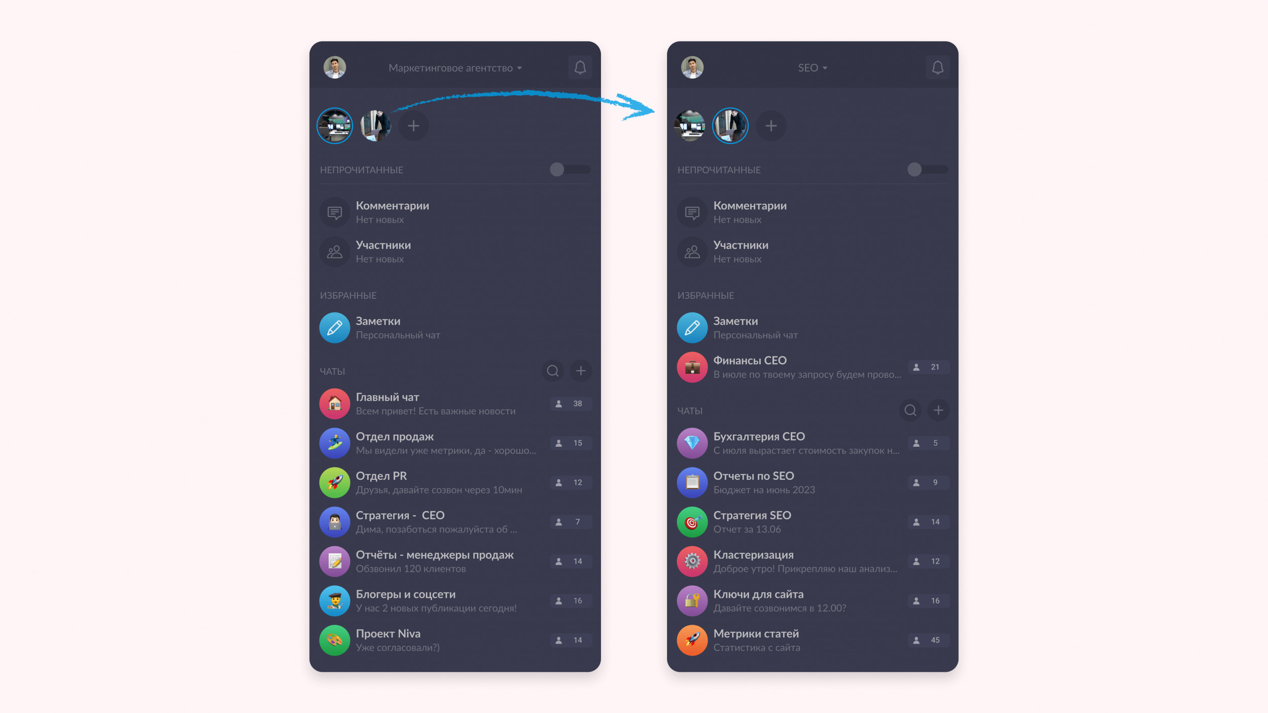 Пользователям доступны только те пространства и чаты, куда они были приглашены администраторами. Перемещение между несколькими рабочими пространствами происходит нажатием одной кнопки — через панель, которая расположена над списком чатов.