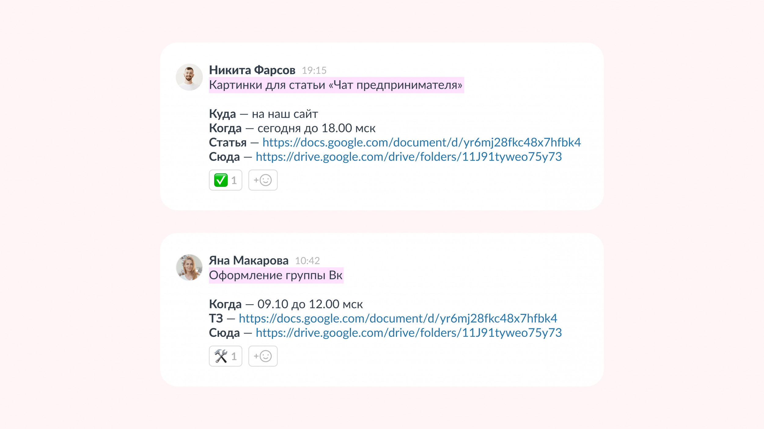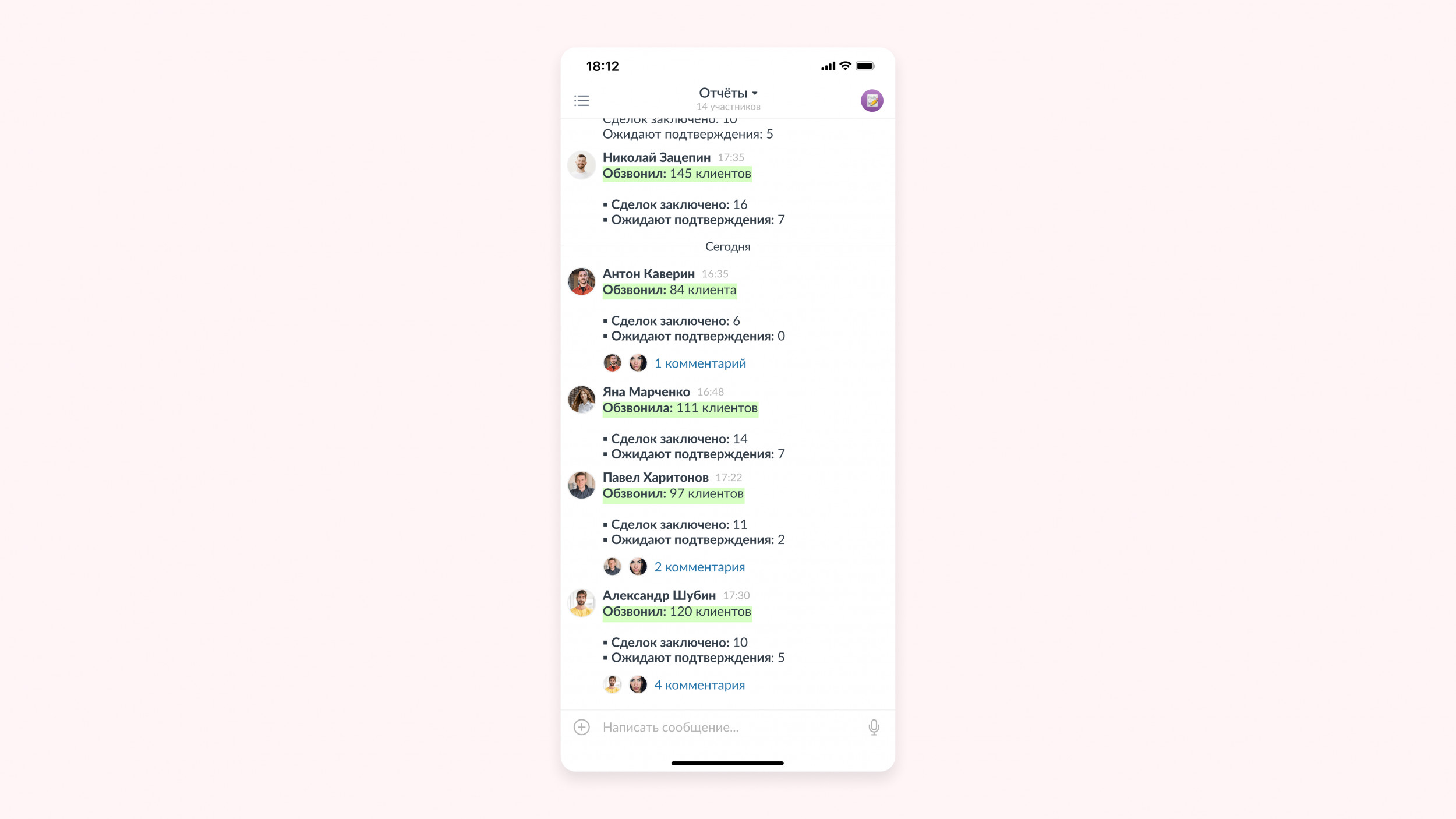 - «Отчеты». Чаты с отчетностью удобно использовать во многих отделах — везде, где важно регулярно отслеживать выполнение планов.
