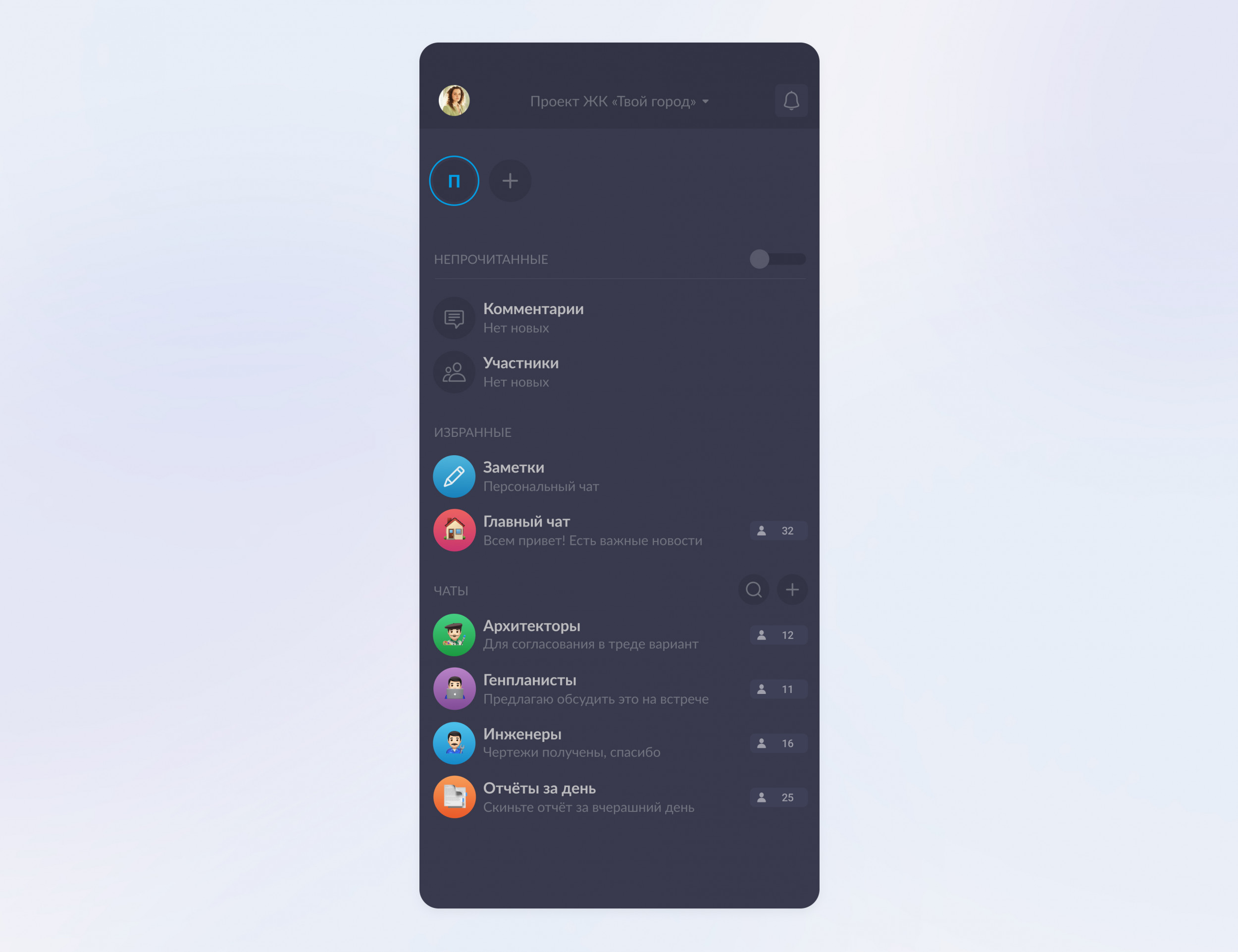Тот же самый руководитель архитектурного бюро при разработке нового проекта строительства может создать отдельное «пространство» и добавить архитекторов, генпланистов, инженеров, проджект-менеджера и представителей заказчика.