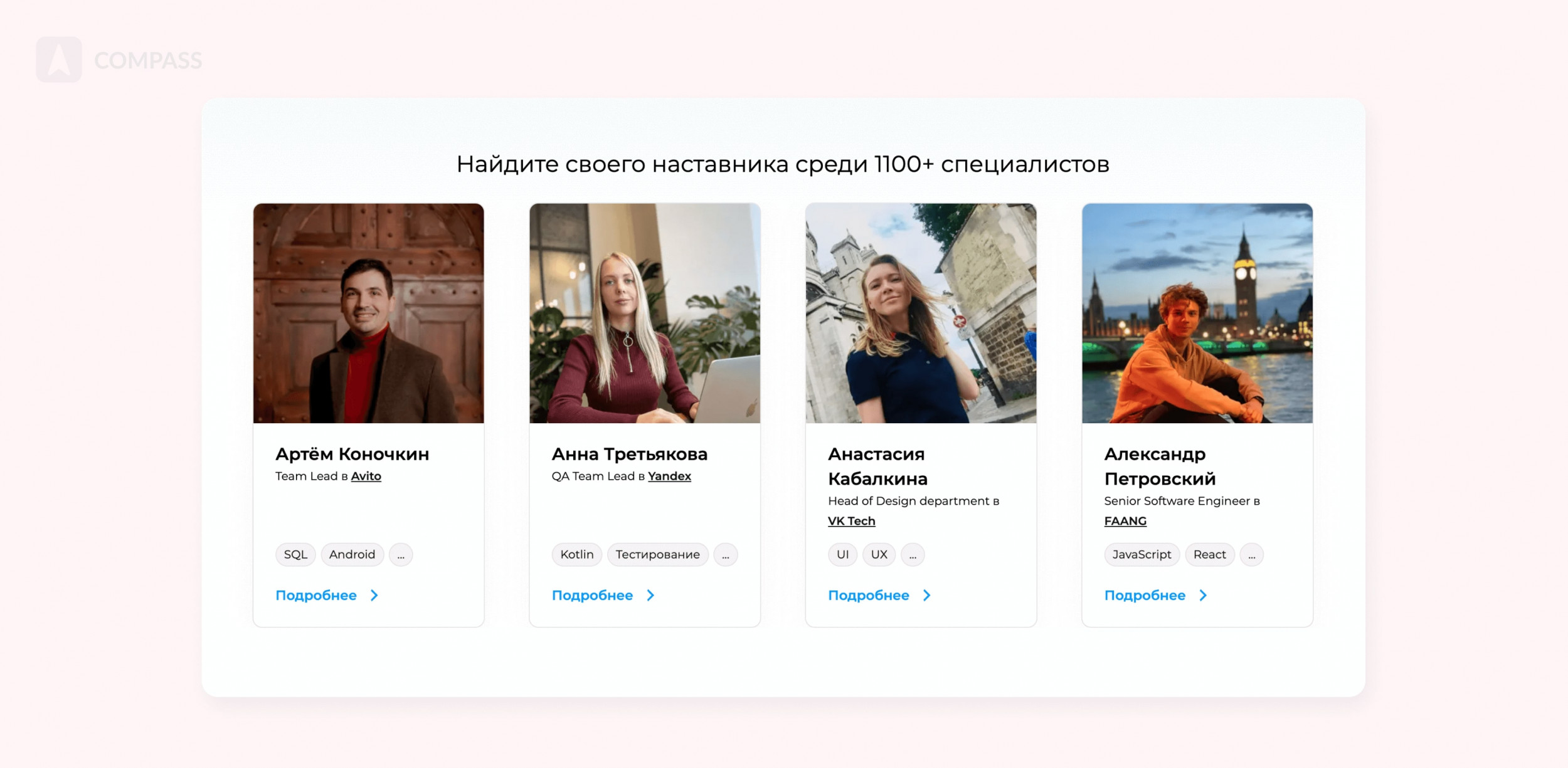 - Подробные карточки наставников с перечислением всех навыков и условий работы.