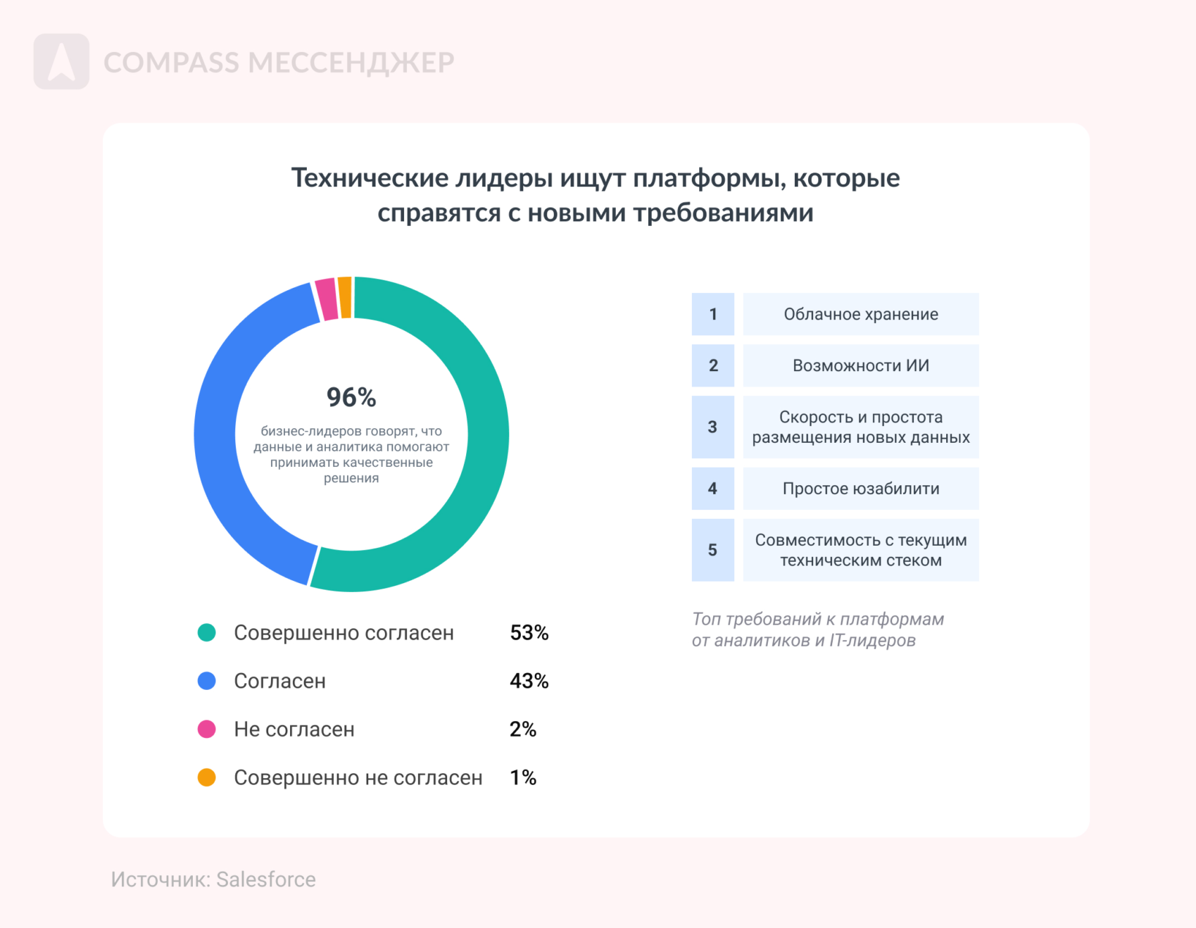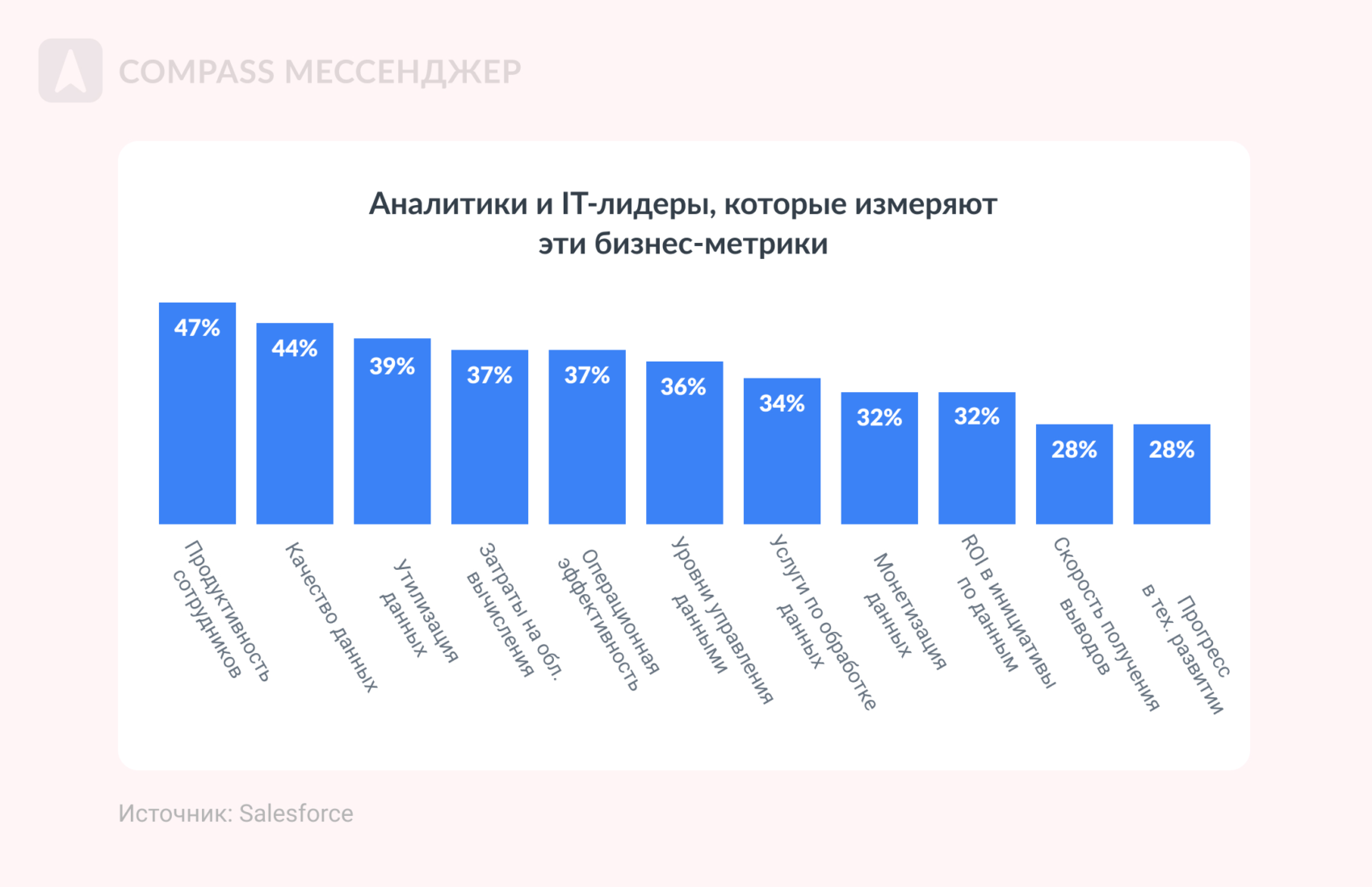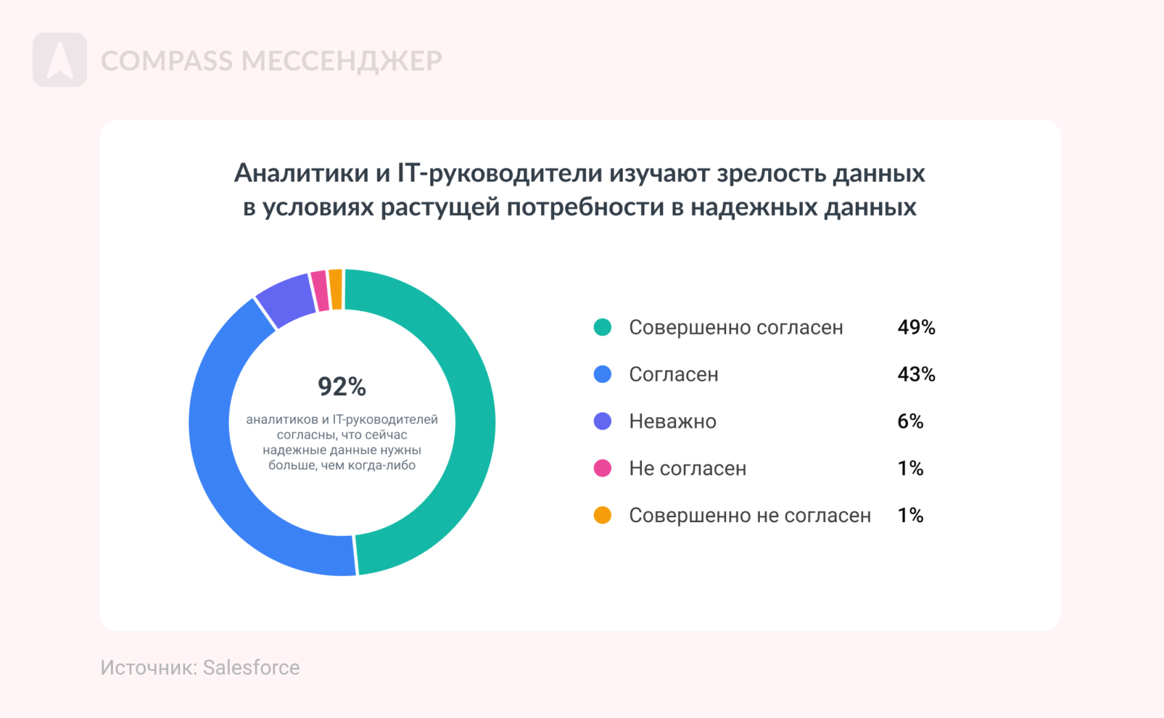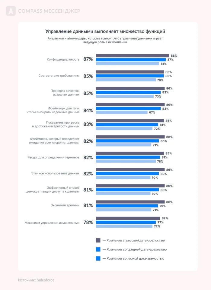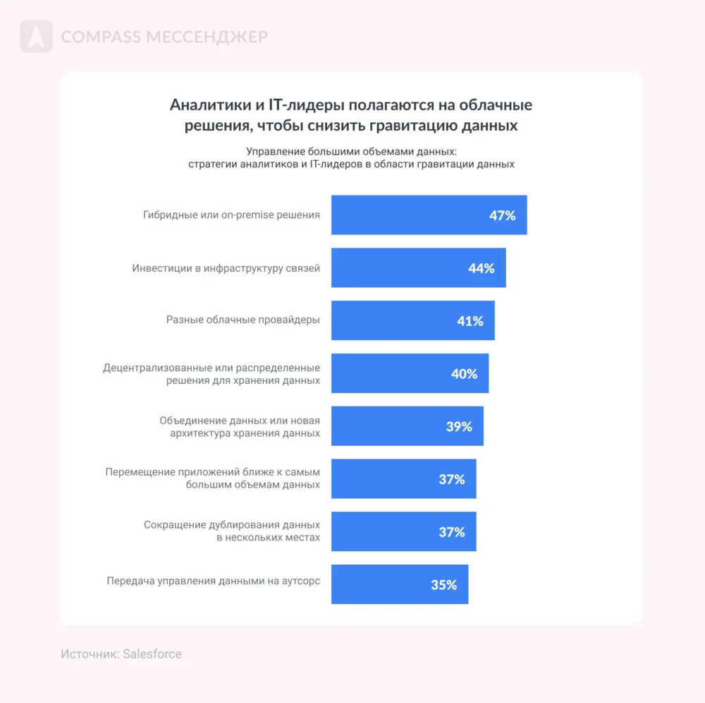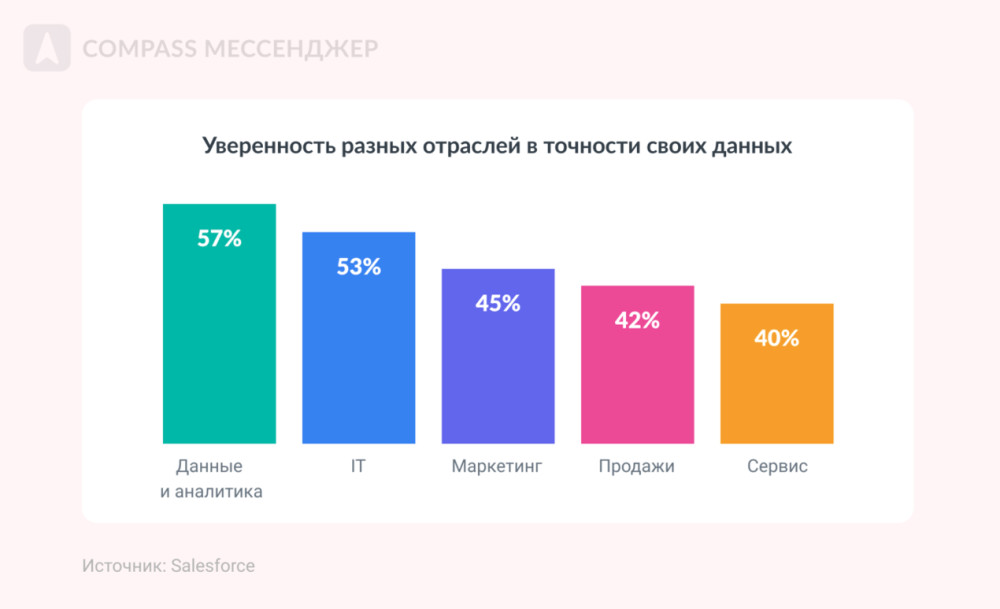 Wendy Batchelder, Chief Data Officer в Salesforce Но дело не только в надежности данных: есть и другие проблемы, которые тормозят компании. Рассказываем о них ниже. ИТ-инфраструктура компаний не готова к ИИ Базы данных компаний и их техническая структура пока не готовы к искусственному интеллекту. Внутри инфраструктуры пока мало инструментов, которые легко синхронизируются с ИИ: просто потому что ИИ — штука новая, а когда инфраструктура создавалась, у нее не было задачи работать с искусственным интеллектом. Нет единой системы данных Если у вас до сих пор вся инфа хранится в десятках таблицах, документах и приложениях, есть повод задуматься о какой-то единой платформе или продуманной системе хранения. Без организованной системы данных ИИ не даст результат. Неточность данных Искусственный интеллект ограничивается данными компании и открытых источников, поэтому может не давать полной картины или использовать ненадежную информацию. Меньше всего в точности данных уверены отделы продаж и сервис, больше всего — подразделения аналитики. Этические вопросы Во-первых, ИИ не всегда принимает решения исходя из ценности человеческой жизни, хотя иногда ее можно задавать, как условие. Во-вторых, ИИ работает на основе данных из интернета, а там полно неэтичных стереотипов. Например, по запросу «доктор» чаще выпадают мужчины, «учитель» — женщина, «женщина» — домохозяйка и прочее. Получается, ИИ заранее необъективен, потому что работает на основе данных из интернета, а в них есть и стереотипы, и пристрастия. Это называется AI bias — пристрастность ИИ. Нет системного сбора данных и дата-стратегии 41% лидеров говорят, что их дата-стратегия только частично согласована с целями или не согласована вовсе. Это значит, что нет связной аналитики данных о пользователе и рынке. А без этого внедрить ИИ сложно: ему просто будет нечего анализировать. Только 32% руководителей и аналитиков измеряют и изучают ценность монетизации данных. Угрозы безопасности 78% аналитиков, руководителей и айти-лидеров говорят, что им трудно добиваться бизнес-целей из-за проблем с данными: в том числе с их безопасностью. Во-первых, уже появляются прецеденты, где ИИ как бы незаконно анализирует материалы книг, например. Хотя авторы на это согласия не давали. Во-вторых, нет ясности: что будет с загруженным в ИИ данными. Непонятно, станут ли они частью знаний ИИ или нет. А там может быть конфиденциальная инфа и о пользователях, и о компании. Получается конфликт: можно внедрить ИИ и добиваться целей с его помощью, но это угрожает безопасности компании и пользователей. Совет № 1: Инвестируйте в проверенную инфу для ИИ, чтобы получать достоверные выводы на выходе 79% аналитиков и руководителей планируют инвестировать в визуализации данных и ИИ, 75% — в обучение и и развитие искусственного интеллекта с помощью проверенных данных. Чтобы получать проверенную инфу для загрузки в ИИ, вкладывайте в аналитику: на аутсорсе или инхаус. Совет № 2: Меняйте подход к управлению информацией, чтобы снизить гравитацию данных Выше мы уже писали, что без единой системы данных сложно внедрить ИИ. Поэтому руководители организуют информацию так, чтобы ее было проще использовать, а не только хранить. Например, 85% аналитиков и айти-руководителей управляют данными, чтобы контролировать и подтверждать качество информации. Если этого н