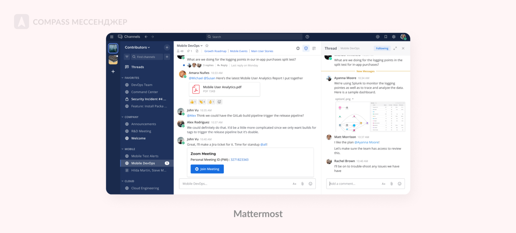 - есть видеозвонки и групповые чаты с тегами, тредами, реакциями, обменом файлами и голосовыми сообщениями;