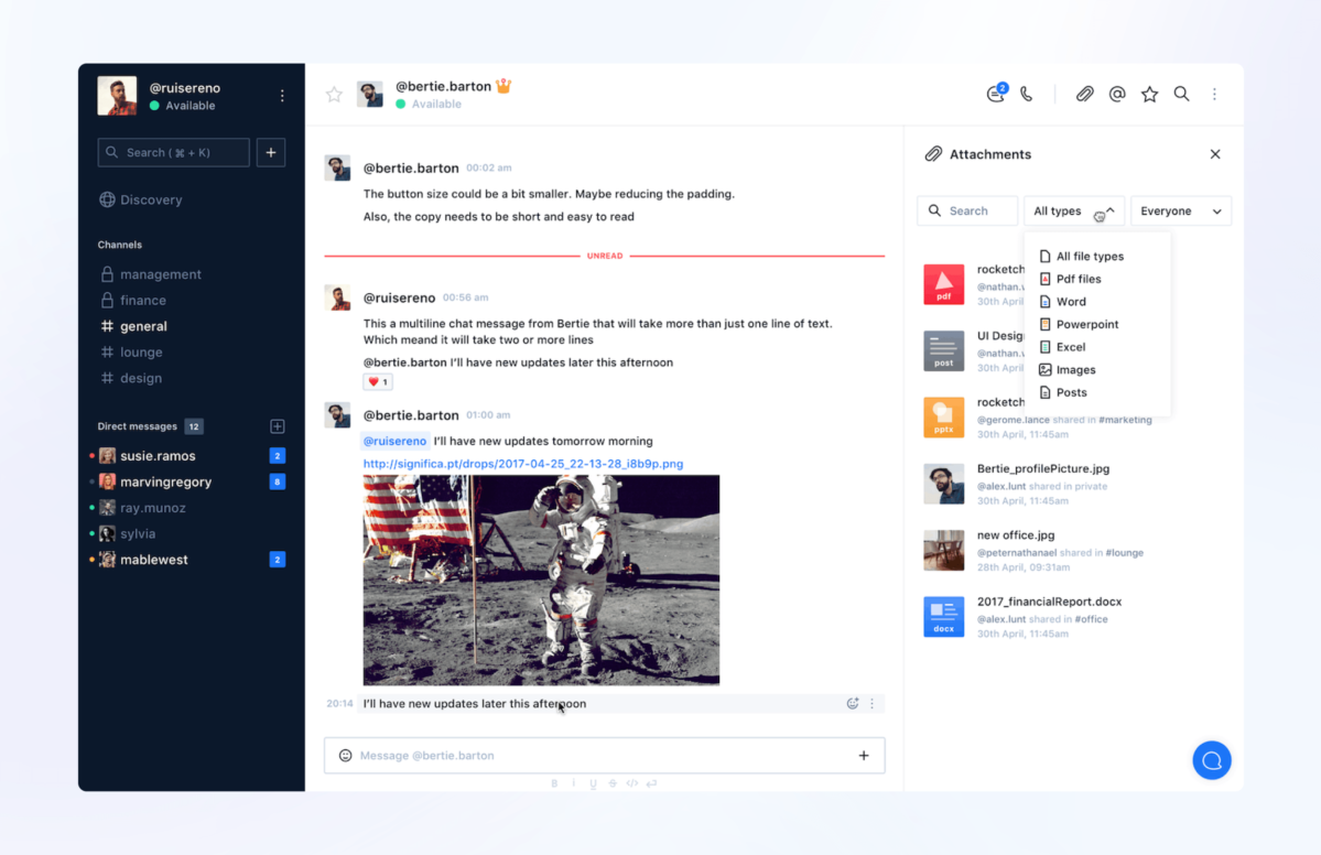 Есть как облако, так и версия для установки на своем сервере. Исходный код серверной части в открытом доступе, а также есть установщик на Github для развертывания «коробочной» версии. Есть ли on-premise: да Какие есть функции: — чаты — отправка файлов (изображения, видео, документы, контакт) — пространства для команд — комментарии к сообщениям и реакции — напоминания на сообщения — сортировка по непрочитанным чатам — отключение уведомлений одной кнопкой в интерфейсе приложения — бесплатный для всех гостевой доступ — глобальный поиск — звонки — цитирование Какие есть интеграции: Двусторонняя интеграция через API Compass с любыми внешними сервисами. Уникальная фишка сервиса: продвинутый поиск. Можно найти важные сообщения и файлы через функцию поиска: поиск учитывает информацию в том числе внутри документов и отображает результаты по всем чатам в рабочем пространстве. Кому подойдет: крупным компаниям, средним и небольшим командам, которым важна скорость работы и структурированное общение. Mattermost — мессенджер для командного общения с бесплатной версией и двумя платными корпоративными. Открытый исходный код бесплатной версии делает Mattermost гибким: его можно настроить в соответствии с потребностями команды, но это потребует времени и свободных рук, которых в команде обычно нет. Есть ли on-premise: да Какие есть функции: — чаты — отправка файлов: изображения, видео, документы, контакт — контроль оповещений — цитирование отправленных и принятых сообщений — возможность управления правами групп — переадресация полученного сообщения другому пользователю — каналы Какие есть интеграции: Интеграции с 700+ инструментам, таким как Gmail, GitHub, Jira, BitBucket, Confluence и другие. Уникальная фишка сервиса: менеджер задач. У сервиса есть собственный менеджер задач, а также широкий круг интеграций с внешними менеджерами. Кому подойдет: тем, кто готов потратить время на внедрение и настройку мессенджера для команды. Rocket.Chat — коммуникационная платформа для сообществ и организаций с повышенными потребностями защиты данных. Его используют организации в 130+ странах мира, включая Всемирный банк, Audi и ВМС США. Есть ли on-premise: да Какие есть функции: — чаты — отправка файлов: изображения, видео, документы, контакт — контроль оповещений — навигация по принятым и отправленным файлам — возможность управления правами групп — отправка изображения и текста одним сообщением — возможность ограничить обмен сообщениями один на один Какие есть интеграции: Поддерживает широкий круг интеграций и позволяет общаться с внешними командами, которые используют для коммуникаций другие системы: Slack, MS Teams, Skype, WhatsApp, Twitter, Jira, Dialogflow, Facebook Messenger и другие. Уникальная фишка сервиса: продвинутый редактор. В сообщениях можно удалить/изменить все изначально прикрепленные к ним файлы, а также поддерживается редактирование изображений перед отправкой. Кому подойдет: командам, которые хотят обеспечить сверхзащиту информации. Element — мессенджер на основе платформы Matrix. Для входа в Element на новом устройстве нужно пройти верификацию по кодовой фразе или комбинации QR-кодов. Есть ли on-premise: да Какие есть функции: — чаты — отправка файлов (изображения, видео, документы, контакт) — отправка стикеров — удаление отправленного сообщения отправителем у себя и у получателя — отправка геолокации участникам чата