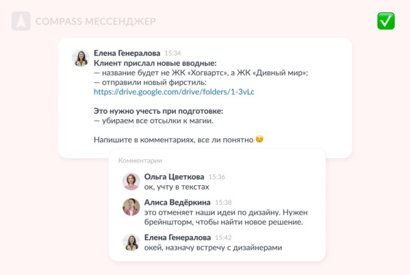 Несколько зумов в день начисто убивают продуктивность. На переключение между встречами и задачами тоже требуется время, и это съедает остатки рабочего дня. Если созвоны назначаются срочно, то у сотрудников и вовсе нет возможности планировать свой рабочий день. Решение: сначала определитесь, какой цели вы хотите достичь встречей и зачем сотрудникам быть там всем вместе. Созвон — окей, если нужно: Даже в этих случаях всегда стоит подумать, что сэкономит больше времени — зум или текст с обсуждением в комментариях. Созвон откровенно бесполезен, если нужно просто донести информацию, которая не требует активных обсуждений. Например, дать инструкцию или сообщить изменения на проекте. Для инструкции лучше подойдет скринкаст, для новостей — текстовое сообщение. ⭐ Совет: прежде чем назначить срочный зум, определите его желаемый итог. Так вы возможно увидите, что для его выполнения к созвону нужно подготовиться заранее, а значит он не может быть срочным. Здесь мы убрали один бесполезный созвон, но нашли тему для другого, полезного Проблема, которая вытекает из ситуации, когда созвоны назначаются по любому поводу. Если есть вопрос, но не до конца понятно, что именно вы будете обсуждать и к чему хотите прийти, созвон рискует превратиться в бесконечное хождение по кругу. В результате коллеги уходят от темы и начинают просто болтать, чтобы заполнить вакуум. Решение: все участники созвона должны понимать, какие вопросы будут обсуждаться. Если вы точно определились, что тема для встречи весомая, значит понимаете, к какому итогу должна прийти команда. Пропишите шаги к этому результату и составьте расписание встречи. Это поможет не затягивать созвоны. ⭐ Совет: для крупных встреч назначайте фасилитатора. Он будет следить, чтобы участники не уходили далеко от темы и соблюдали расписание. На встрече нужно обсудить идеи и найти решение, а идей нет: никто не подготовился заранее и импровизация не сработала. Начинается общее размышление и встреча опять растягивается до бесконечности. Итогом становится не самый лучший вариант, слепленный наспех, чтобы хоть что-то решить. Решение: если к созвону можно подготовиться, так и нужно сделать. В сообщении о встрече прикрепите ссылки на всю нужную информацию и общий рабочий документ, например, гуглдок. Попросите участников заранее подготовить и написать идеи. Тогда совещание сразу начнется с презентации решений, которые команда обсудит, докрутит и выберет лучший вариант. ⭐ Совет: договоритесь с коллегами включать камеры на созвонах — это дисциплинирует и побуждает человека лучше подготовиться к встрече. Часть сотрудников могла вообще не присутствовать на созвоне, потому что там обсуждают другую сферу работы. Их позвали по умолчанию, как участников команды, ведь «Нам всем нужно быть в одном информационном поле». Лишние участники превращаются в тихих привидений, которые просто ждут, когда это все закончится. Либо же задают странные вопросы, чтобы оправдать свое присутствие, что сбивает темп встречи. Они не могут делать свои задачи, пока не закончится созвон, но и пользы, как правило, никакой не приносят. Решение: приглашенных к участию должен быть минимальный минимум. Иначе ни времени не хватит, ни вопрос не решится. Прежде чем автоматически отправить приглашение всей команде, определите, кому точно нужн