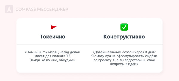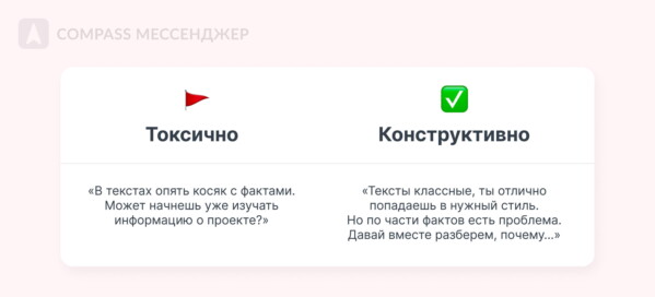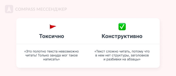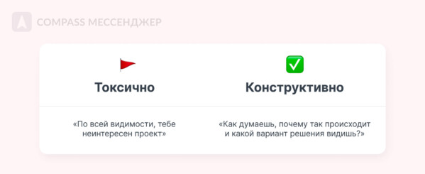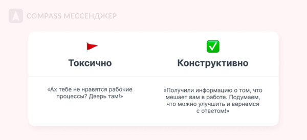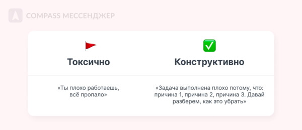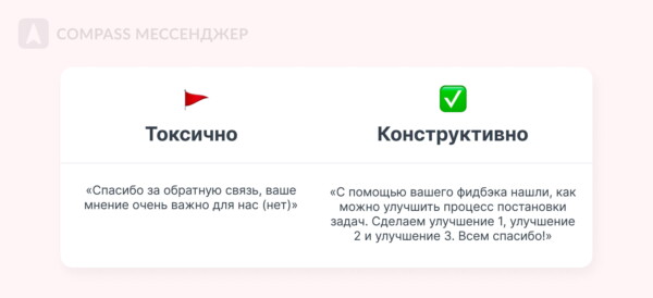 Как это происходит в здоровой команде: конструктивный фидбэк затрагивает только работу человека. Комментировать личные качества, ум, воспитание и внешность — абсолютное табу. Сравнения тоже неуместны, ведь если коллега лучше выполняет эту задачу, ее нужно было поручить ему. Пусть коллег хвалят их друзья и партнеры, на работе все эти нежности ни к чему. Не тратьте свое драгоценное время: есть претензии по задачам — сразу их и говорите. Между прочим, это называется корректирующая обратная связь, а остальные ее виды вам и знать не нужно. Следующий уровень токсичности — обратная похвала. Запутайте разум коллег фразами «Ну можешь же когда хочешь» и «На третий раз наконец-то справились». Пусть сотрудники не забывают, что даже при хорошей работе, они все еще далеки от совершенства. Это не даст им расслабиться и почивать на лаврах. В здоровой команде даже корректирующую обратную связь принято начинать с сильных сторон работы, и только потом переходить к критике. А чтобы улучшить мотивацию сотрудников применяют еще поддерживающий и развивающий фидбэк. О них мы рассказывали в этой статье. Чем абстрактнее ваша обратная связь, тем лучше. Не утруждайте себя деталями и примерами. Пусть собеседник сам догадается, что именно ему нужно исправить. Это улучшит его логическое мышление. Вместо конкретики щедро добавьте эмоций. Если вы сказали, что хотели, а коллега не понимает — не сдерживайте себя: здесь можно и прикрикнуть, и по столу кулаком ударить. Так сотрудник поймет, что в отличие от него, вы всю душу вкладываете в эту работу. В здоровой команде обратная связь дается максимально конкретно и в нейтральном тоне. Вы не делаете трагедию из ошибок, а вместе ищете причины и решение, как не допустить их повторения. Выпустите в воздух свое мнение и пусть его унесет встречный ветер — обратная связь нужна, чтобы облегчить вашу душу. Если контекст требует ответов от сотрудника, придумайте их за него, ведь вы умнее по всем вопросам. Если человек пытается ответить сам — игнорируйте. Помните, что время — ваш самый дорогой ресурс, и нет смысла тратить его на чужие доводы. В здоровой команде тот, кто дает фидбэк, не додумывает за собеседника, а задает ему вопросы. Суть в том, чтобы позволить коллеге самому разобраться в проблеме, найти комфортное для себя и команды решение. Это улучшает скиллы сотрудника. Не стесняйтесь давать обратную связь в самый неожиданный момент. Например, во время обеда или перед важной встречей. Пусть коллеги знают, что вы всегда думаете об общем деле. И никаких сроков давности: смело вспоминайте ситуации, случившиеся пару месяцев назад. Так вы тренируете память сотрудников. Если же вашу обратную связь коллеги ждут, чтобы продолжить работу — не торопитесь. Выдайте ее, когда сроки начнут гореть. Ну и что, если людям придется задержаться, чтобы переделать задачу? Сталь закаляется в огне. В здоровой команде для обратной связи по важным вопросам назначается отдельная встреча. К ней готовится и сотрудник, и руководитель. Регулярно запрашивайте фидбэк с предложениями по улучшению, говорите, что это очень важно для развития компании. И ничего не делайте. Рано или поздно коллеги это заметят. Никто не любит сливать свои силы в пустоту, так что скоро их стремление помочь вам и компании достигнет нуля. Если повезет, особо активные даже обидятся. В