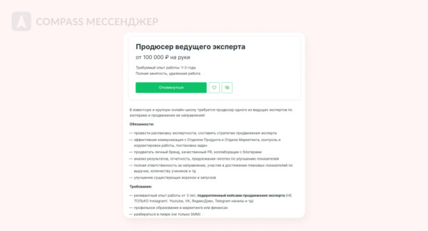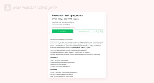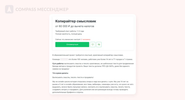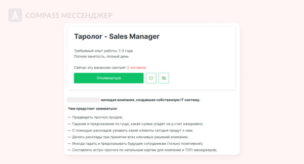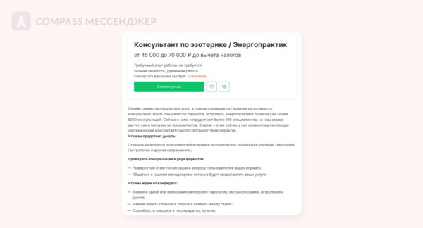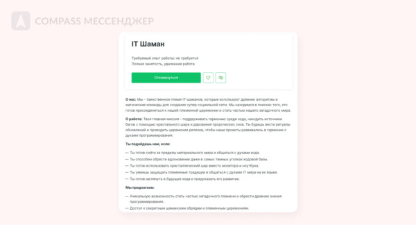 Оплата труда: еженедельный расчет в зависимости от количества пентаклей на вытянутой карте. Премия, если выпал Туз Жезлов или Верховный Жрец. Пример бизнеса, который уже сориентировался и ищет подобного специалиста Будет незаменим для того, чтобы описать вам, команде и потенциальным заказчикам, чем вы тут вообще занимаетесь. Проведет распаковку личности основателя, составит фоторобот бренда, придаст смысл любому делу. И заодно подскажет, как настроить воронки продаж, с которыми вы сделаете сотню успешных запусков. Чтобы не терять время, сразу возьмите ему в помощники копирайтера-стажера. Он сможет трансформировать поток информации из космоса в интригующие тексты для сайта и соцсетей. Тестовое задание: экспресс-распаковка личности по вашим любимым занятиям из детства. Оплата труда: Х рублей за смысл с повышающим коэффициентом за экспертность. Важный навык для такого специалиста — создавать интригу Все дела в интернете лучше поручить одному специалисту, чтобы не раздувать штат. Он станет вашей правой рукой и тем, кому можно отдать абсолютно все диджитал-задачи: создание сайта, ведение соцсетей, выход на маркетплейсы. А также заказ продуктов и бронирование билетов для ваших путешествий. Идеальное решение — нанять амбициозного молодого человека без опыта, который пока не знает, в какой профессии стоит развиваться, но сможет работать по 12 часов день. Пообещайте ему обучение от руководителя бизнеса с многомиллионным оборотом и доступ к уникальной базе знаний. Тестовое задание: не требуется. После мотивирующего собеседования рекомендуется сразу дать полную нагрузку задачами, до которых не доходили руки. Оплата труда: прожиточный минимум и восхищение трудолюбием. Friendly Reminder: Мессенджер Compass можно установить на свой сервер всего за 10 минут. Специалист, который не позволит застрять в развитии вам и остальным участникам команды. Основная обязанность — проводить еженедельные семинары по самопознанию и духовному пробуждению. Практики прокачают компанию и выведут вас на новый уровень восприятия. Наставник научит коллег правильно формировать намерение и позволять себе зарабатывать больше. Три подхода по пятнадцать аффирмаций в день, и готово: команда проводит запуски, бизнес приносит деньги, а вы попиваете джус на вилле в любой модной стране. Почему же такой специалист не прокачивает свой бизнес, чтобы зарабатывать миллиарды? Такова его миссия — помогать другим с нуля строить денежную империю. Хватайте быстрее, пока не передумал. Тестовое задание: отправить голосовое с утренней медитацией для настроя на успех. Оплата труда: криптовалюта, чтобы специалист мог продолжить свой путь в этом воплощении на Бали. Действительно успешный бизнес невозможно построить без подтягивания ресурсов у изобильной Вселенной. Проверить этот софт-скилл довольно просто: если вам все еще не подарили квартиру, машину и пару миллионов просто так — значит, вам срочно нужен переводчик с человеческого на межгалактический. Этот специалист свяжет вас с материей, поможет найти подход ко Вселенной и черпать из нее все возможные блага. Проверить кандидата на профпригодность тоже легко: в мотивационном письме пусть отправит рабочий марафон желаний. Тестовое задание: составить гайд по получению денег из окружающего пространства. Оплата труда: оклад, преми