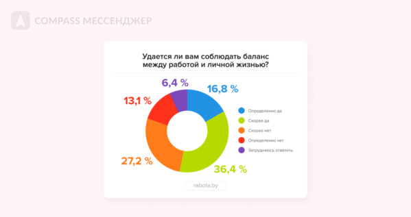 Переосмыслите роль труда и поставьте его на реалистичное место среди других жизненных приоритетов. Малесик убежден, что в современном обществе мы склонны превозносить работу, делая из нее главный и порой единственный источник самореализации. Но на самом деле работа — лишь одна из многих частей полноценной жизни. Игнорируя этот совет, вы рискуете полностью утонуть в работе в ущерб семье, отношениям, хобби, саморазвитию. В погоне за профессиональными высотами можно потерять связь с другими составляющими счастья, что неизбежно приведет к выгоранию. Составьте список всех значимых сфер жизни помимо работы: отношения, дети, родители, дружба, хобби, спорт, путешествия и так далее. Затем распределите 100 баллов между всеми категориями так, чтобы визуализировать их реальную ценность. Вполне вероятно, что трудовая деятельность займет всего 20-30 баллов и будет казаться уже не такой важной. Можно пойти дальше и составить такую таблицу в Google или Excel. Присвойте сферам жизни от 1 до 5 баллов и посмотрите, что получилось на диаграмме Одна из основных причин выгорания — размытые границы. Работа постоянно вторгается в личное пространство, стирается грань между профессиональной сферой и всем остальным. В результате сотрудник оказывается постоянно «на привязи» и отказывается от полноценного отдыха и смены деятельности. Если не установить рамки — есть высокая вероятность, что работа полностью поглотит вас. Времени на семью, хобби и развлечения не останется совсем, а это верный путь к деградации личности. Исследованиепроводилось в 2022 году rabota.by совместно с Viber. Из 2 158 участников только 16,8% уверенны, что соблюдают баланс Чтобы этого избежать, автор советует четко определить, в какие часы вы трудитесь, а когда время полностью принадлежит вам. Например, можно установить жесткое правило не открывать рабочие чаты и почту после 19 часов вечера. Будет проще соблюдать это правило, если для работы использовать отдельный корпоративный мессенджер. Выделите несколько вечеров в неделю под «время без работы» для встреч с друзьями и полноценного отдыха с семьей. А на все выходные ставьте статус в личном кабинете «офф до понедельника» и выключайте оповещения, чтобы полностью исключить себя из рабочих процессов на это время. Friendly Reminder: Мессенджер Compass можно установить на свой сервер всего за 10 минут. Полезные привычки и регулярные ритуалы предотвращают выгорание, а также держат в тонусе физическое и психическое здоровье. Малесик подчеркивает, что выгорание часто происходит из-за хронического стресса и отсутствия баланса в жизни. Без полезных привычек, человек рискует погрузиться в болото негативных эмоций, бесконечных переработок, плохого питания и отсутствия отдыха. Это неизбежно ведет к снижению работоспособности, апатии, упадку сил и в конечном итоге к выгоранию. Автор рекомендует ежедневно делать физические упражнения и практики осознанности (йога, медитация), спать по 7-9 часов, сбалансированно питаться и много пить. Вроде банальные вещи, но почему-то так редко соблюдаются. Также важно регулярно проводить «время с самим собой» без гаджетов и инфошума. Например, читать бумажные книги, рисовать, заниматься рукоделием или просто гулять на природе. Подобные привычки и ритуалы помогают снизить стресс, обрести душевное спокойствие и зарядиться для продукти