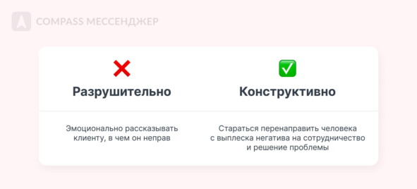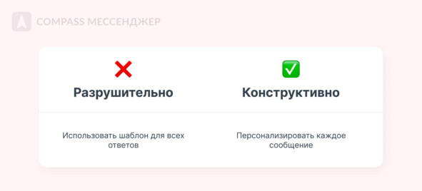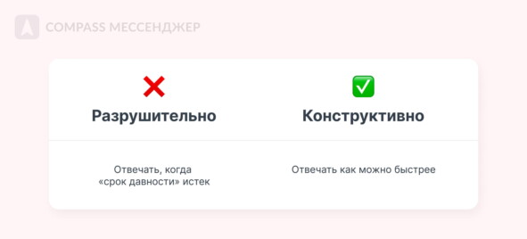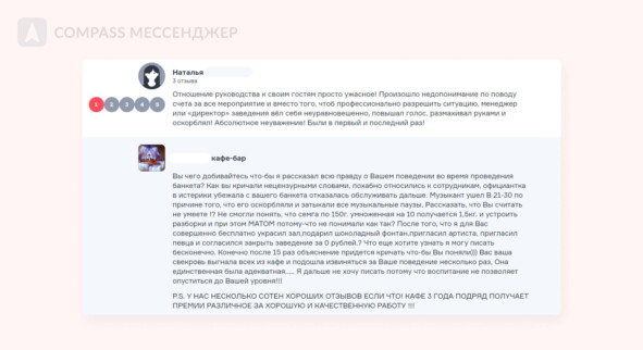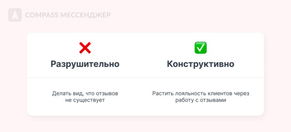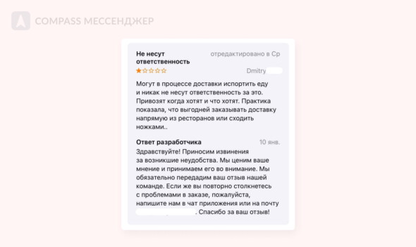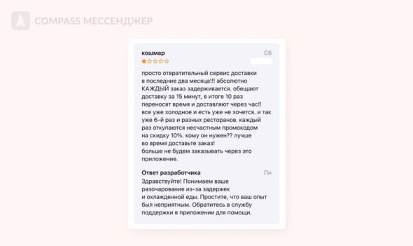 Сейчас вас волнуют только потенциальные клиенты, которые могут принести вам деньги. Вот с ними и пообщайтесь. В нормальном мире компании стараются отвечать на каждый отзыв, потому что это отличный способ стимулировать первую или повторную покупку. Помните, вы отвечаете не одному человеку, а тысячам потенциальных клиентов, которые сверяют информацию о вас и о конкурентах перед покупкой. Клиент оставил плохой отзыв и ждет, что сейчас перед ним будут лебезить и извиняться? Как бы не так! Обезоружьте противника нестандартным поведением — атакуйте в ответ. Пройдитесь по деталям заказа, обвините в склочности и перейдите на личности. А то чего это он здесь в «белом пальто» стоит. Помните, если клиент недоволен — это не ваш клиент. Он вас недостоин, так что пусть попробует найти ваш уникальный продукт в другом месте. У вас таких как он — целая очередь за забором стоит. В нормальном мире компания, которая хочет чтобы у нее были клиенты, не может позволить себе злость в ответ на злость. Чтобы конструктивно отвечать на откровенно ругательные отзывы, нужно уметь отключать эмоции и не принимать негатив на свой счет. Главная цель работы с негативом — разобраться в ситуации с одним клиентом и показать остальным, что компания не боится брать на себя ответственность. Чтобы это сделать, нужно понять суть претензий человека и показать ему заинтересованность в решении общей проблемы. Если все получится, недовольный клиент даже может превратиться в лояльного и постоянного. Совет: давайте читать ответы на негативные отзывы кому-нибудь из коллег. Вы можете не отследить случайную пассивную агрессию, а со стороны это будет заметнее. Самый действенный способ сэкономить ваше время — использовать один шаблон ответа на все отзывы, хорошие и плохие. Этим вы догоните двух зайцев: и работа как бы выполнена, и назойливый клиент увидит, что он здесь совсем не особенный. А еще, потенциальные покупатели увидят, что компания работает, но не заинтересована в общении, и дважды подумают, пользоваться ли ее услугами. В нормальном мире одинаковые тексты в ответах на отзывы вызывают только раздражение и показывают клиентам, что компании не интересно их мнение. Поэтому вместо шаблонов лучше разработать инструкции ответов для разных ситуаций. Они помогут специалистам понять, по какому алгоритму обработать данный тип отзыва, но не отменят персонализацию ответа. Есть еще одно хорошее правило: чем больше сил человек вложил в свой отзыв, тем более личным и подробным должен быть ответ. Friendly Reminder: Приведите коммуникацию в порядок в мессенджере Compass. Можно использовать облачную версию или развернуть мессенджер на своем сервере всего за 10 минут. Скидки и промокоды — это скотч, которым можно исправить поломку любой сложности. И отличный выход из ситуации, когда на вас нападет орда недовольных покупателей, с которыми неохота разбираться по отдельности. При любом недовольстве клиента, просто кидайте в него промокодом. Например, на скидку 100 рублей на следующий заказ от 3000, со сроком действия 3 дня. Если человека такое не устроит, то проблема однозначно в нем: ведь вы проявляете неслыханную щедрость, а он продолжает обижаться, как маленький. В нормальном мире промокоды и скидки — один из самых действенных способов сгладить негатив. Но бывают ситуации, когда они неуместны. Наприме