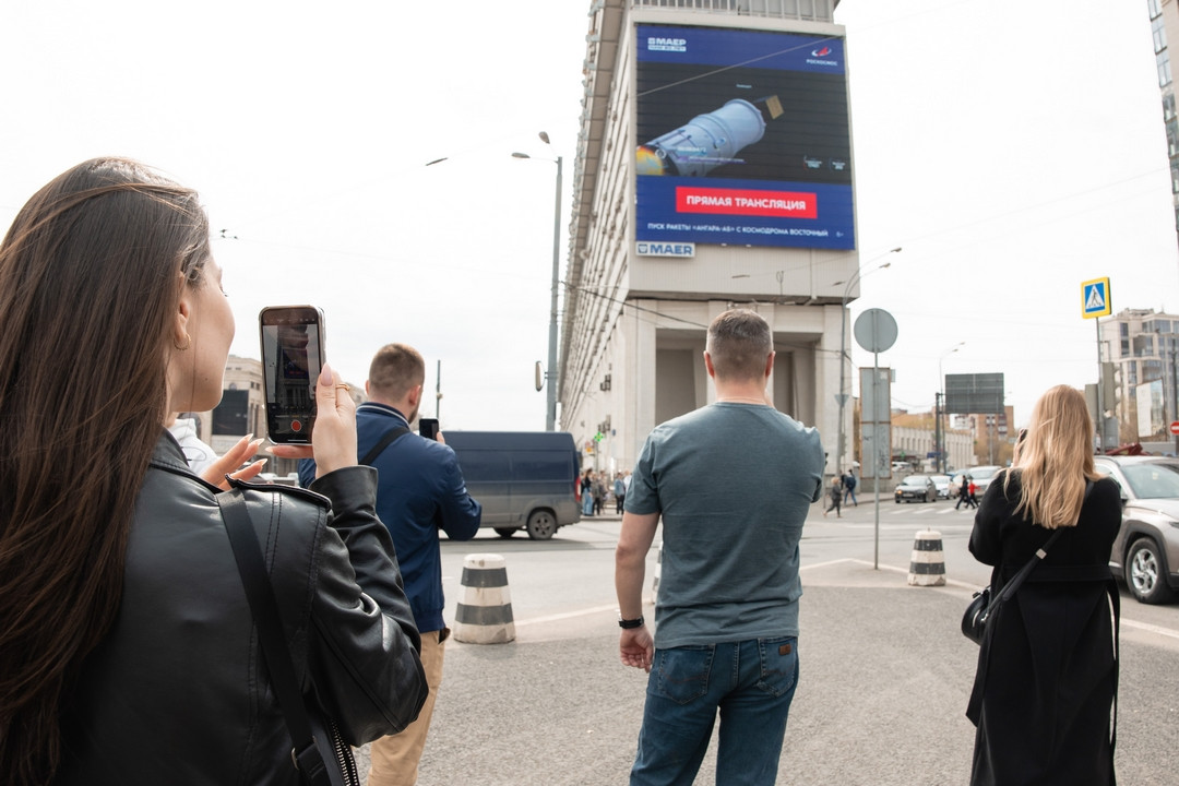 Трансляция уникального события, которое открывает новую страницу в истории ракетно-космической отрасли страны, организована на огромных цифровых уличных экранах в Москве, Екатеринбурге, Челябинске, Новосибирске, Уфе, Тюмени, Самаре, Нижнем Новгороде, Волгограде и других городах.