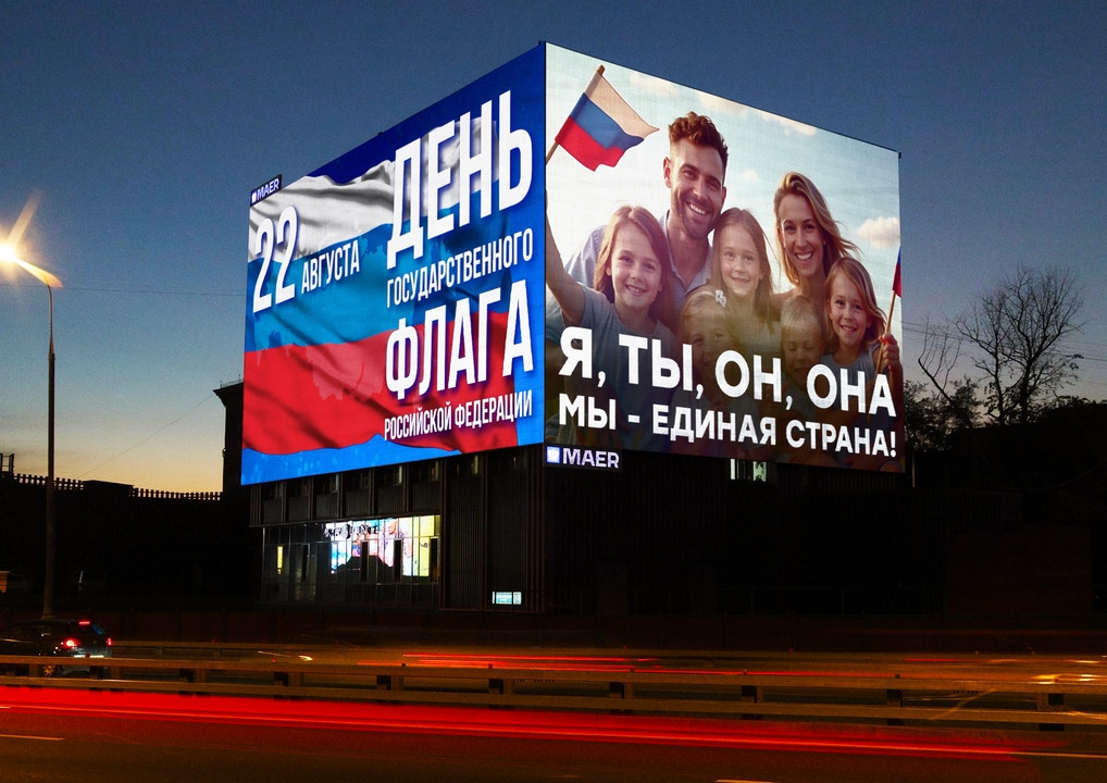 Появление праздника связано с провалом августовского путча в 1991 году. 22 августа, на следующий день после роспуска ГКЧП, Верховный совет РСФСР выпустил постановление, по которому национальным флагом стало "полотнище из равновеликих горизонтальных белой, лазоревой и алой полос«.Уже в 1993-м был принят закон «О Государственном флаге Российской Федерации», по которому лазоревую и алую полосы заменили на синюю и красную. А в 1994 году первый президент России Борис Ельцин в память о возвращении исторического флага постановил отмечать 22 августа как государственный праздник. В указе было особо отмечено, что эта знаменательная дата необходима «в целях воспитания у нынешнего и будущих поколений граждан России уважительного отношения к государственным символам». Медиахолдинг показывает поздравления с Днем флага на 150 цифровых конструкциях по всей стране. МАЕР стремительно увеличивает свое присутствие в двух десятках регионов России. Только с начала лета новые цифровые экраны появились в Санкт-Петербурге, Сочи, Анапе, Краснодаре, Уфе, подмосковных Химках, Котельниках, Красногорске и на Рублево-Успенском шоссе. Все это дало рост охвата аудитории по всей сети в сравнении с летом прошлого года на 128%. В настоящий момент единая сеть медиафасадов и цифровых экранов МАЕР обеспечивает в целом свыше 6 миллиардов визуальных контактов в месяц.
