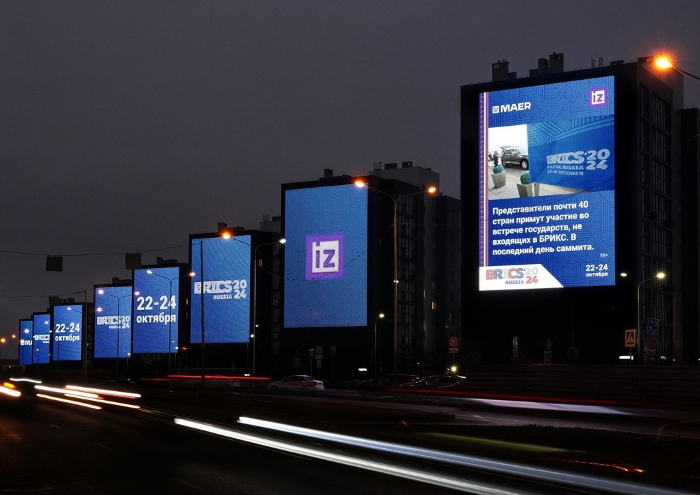 В преддверии БРИКС на всех медиафасадах МАЕР зрители увидели важные показатели, характеризующие экономический и политический потенциал объединения, которое становится ключевым игроком в современном мире. С помощью наглядной инфографики телеканал «Известия» показал рост объединения, рассказал, какую долю оно занимает в мировой торговле, промышленности, сколько на эти страны приходится полезных ископаемых, топливных ресурсов и запасов золота.