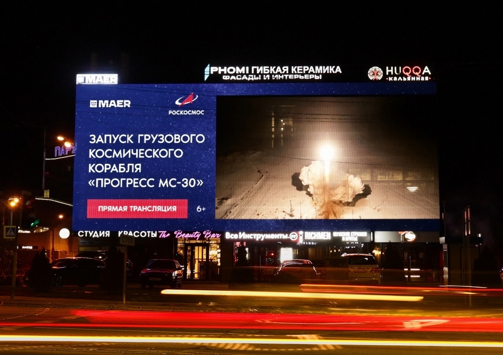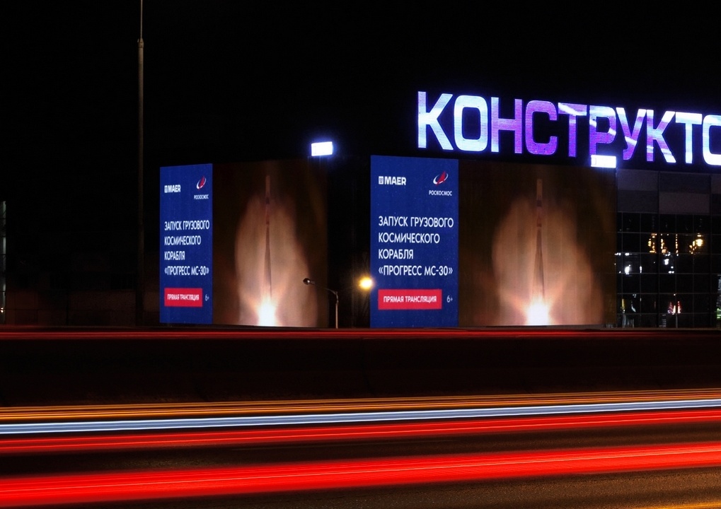 Среди грузов — новый скафандр «Орлан‑МКС» № 6 для выходов космонавтов в открытый космос по российской программе. Также на корабле отправлены укладки для проведения на станции экспериментов «Асептик», «Биодеградация», «Виртуал», «Каскад», «Лазма», «Мираж», «Нейроиммунитет» и «Фотобиореактор». Ночной запуск «Прогресса МС-30» транслировали в Московской области, Санкт-Петербурге, Владивостоке, Кемерове, Краснодаре, Оренбурге, Сочи, Новосибирске, Самаре, Казани, Хабаровске, Омске, Нижнем Новгороде, Уфе. Лучшие моменты запуска можно будет увидеть и на медиафасаде, который расположен на здании Национального центра «Россия» в Москве. Они будут транслироваться до 2 марта включительно. От Южно-Сахалинска до Владикавказа на своих ресурсах трансляцию провели СМИ, вошедшие в холдинг МАЕР. Создание полноценной экосистемы медиа дает возможность выстраивать максимально эффективную коммуникацию с любой аудиторией: и на улицах городов, и в онлайн-СМИ, и в диджитал-каналах. Ежемесячная аудитория всех ресурсов холдинга на сегодняшний день составляет 50 млн человек. На ракету «Союз‑2.1а», предназначенную для запуска корабля «Прогресс МС‑30», нанесены изображения, посвященные 60‑летию первого выхода человека в открытый космос, 100‑летию космонавта Павла Беляева, 100‑летию Международного детского центра «Артек» и старту форумной кампании Росмолодежи. Трансляции запусков космический кораблей на уличных цифровых экранах стали привычны для жителей крупных российских городов. Только за прошлый год информационные кампании МАЕР с Роскосмосом увидели почти полмиллиарда раз. Каждая трансляция — это не только зрелище, но и важный шаг для популяризации космической отрасли. Напомним, медиахолдинг МАЕР владеет крупнейшей высокотехнологичной цифровой сетью рекламных поверхностей, которая на сегодняшний день обеспечивает свыше 8,2 млрд визуальных контактов в месяц. Ежемесячная аудитория в России составляет порядка 50 миллионов человек. В ближайшее время медиахолдинг намерен запустить Единую платформу цифровых коммуникаций, в основу которой легли 24 патента и 37 технологических решений.