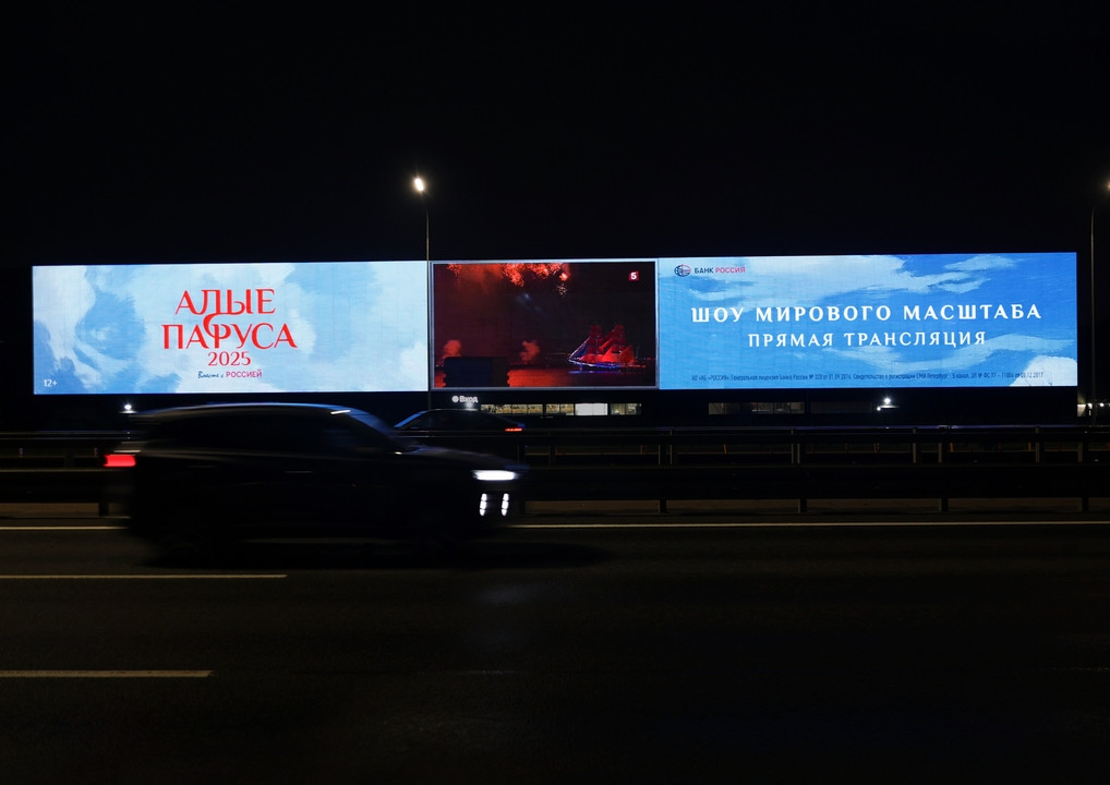 Медиахолдинг МАЕР расширил границы праздника за пределы Северной столицы, запустив трансляцию в режиме реального времени на цифровых экранах и медиафасадах на улицах российских городов. Красочное прохождение брига с алыми парусами на улицах своих городов в моменте увидели более 200 тысяч человек. А на следующий день, уже днем, запустили ролики с самыми яркими моментами праздника. Завершился праздник проходом брига «Россия» по акватории Невы под залпы салюта. Впервые праздник состоялся в Ленинграде летом 1968 года, когда по глади Невы проплыл корабль с алыми парусами, воплощающими юношеские надежды, мечтания и вступление во взрослую жизнь.
