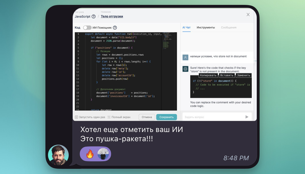 Прелесть AI ассистента на Нодуле в том, что он совершил семимильный шаг по пути реализации нашей миссии: теперь создание собственных микросервисов или построение сложных автоматизаций доступно даже тем, кто до этого в жизни с кодом не взаимодействовал! Рассмотрим 3 сценария использования, чтобы это доказать.