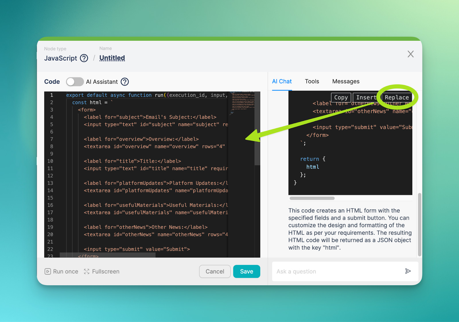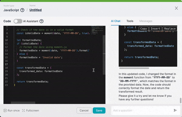 Так JavaScript модуль вернет нам «html» JSON объект для использования его в webhook response, где помимо этого мы меняем параметр типа контента на text/html для корректного отображения формы по ссылке из нашего входного webhook. Теперь, открывая ваш webhook url, вам отобразиться форма для сбора данных. Единственное, что остаётся, это сделать так, чтобы полученная через форму информация передавалась на webhook другого сценария для дальнейшей с ней работы. Естественно, писать сами мы ничего не будем: Теперь наша форма становится полностью активной и готовой принимать входящую информацию. Можно передать полученные значения на сценарий, который сразу же зафиксирует их, к примеру, в Google таблицу. В мире насчитывается более миллиона NPM пакетов (готовые приложения для программистов, которое они добавляют в свой код), доступ к которым вам может обеспечить ИИ ассистент на Нодуле. Предположим, в вашем сценарии понадобился актуальный обменный курс USD/EUR для осуществления торговли в разных валютах и предоставления актуальной информации на сайте для клиентов. Нежели мучать себя поиском нужной API и чтением документации, озвучьте ваш запрос следующим образом: Корректный результат не всегда достигается с первого раза: иногда получаем ошибки, иногда пустые значения на выходе. Главное не забывать, что отладка ошибок — это тоже не наша забота. Чтобы все было исправлено, попросите ИИ добавить в код console.log для детализации серверного ответа. Далее, возвращаете любую ошибку в чат с ИИ — и новый код перед глазами! Также вы можете забыть о головной боли при преобразовании данных, таких как, например, форматирование даты. Вам ведь знакомо, когда системы отдают дату в одном формате, например, «YYYY-MM-DD», но другая система должна их принять в другом — «DD MMMM YYYY» Результат преобразования полученной через webhook даты формата ‘2023-07-11’: Аналогичным образом ИИ может помочь вам преобразовывать строки, агрегировать данные, фильтровать, сортировать, трансформировать, соединять, разделять, удалять дубликаты, проводить статистический анализ и даже анализировать текст. В предыдущей части статьи мы обращались к ассистенту через диалоговое окно, но есть еще один вариант, который будет полезен для более предметной отладки какой-то части кода, или для просьбы объяснить, что в нем происходит: В настоящее время сообщество платформы Нодуль активно набирает обороты и специалисты в области low-code присоединяются к нашему чату, где команда проекта рада фидбеку и готова помочь со всеми вопросами! Важная ремарка: платформа находиться в бета и предоставляет бесплатный доступ для всех желающих! Ждем вас на Нодуле и в Телеграмм сообществе!