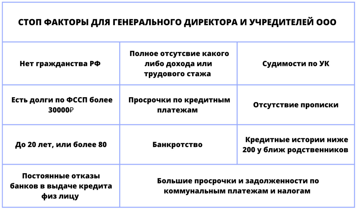 Первым делом банки анализируют кредитную историю генерального директора и учредителей. Логика проста: ненадежные собственники — ненадежный бизнес.
