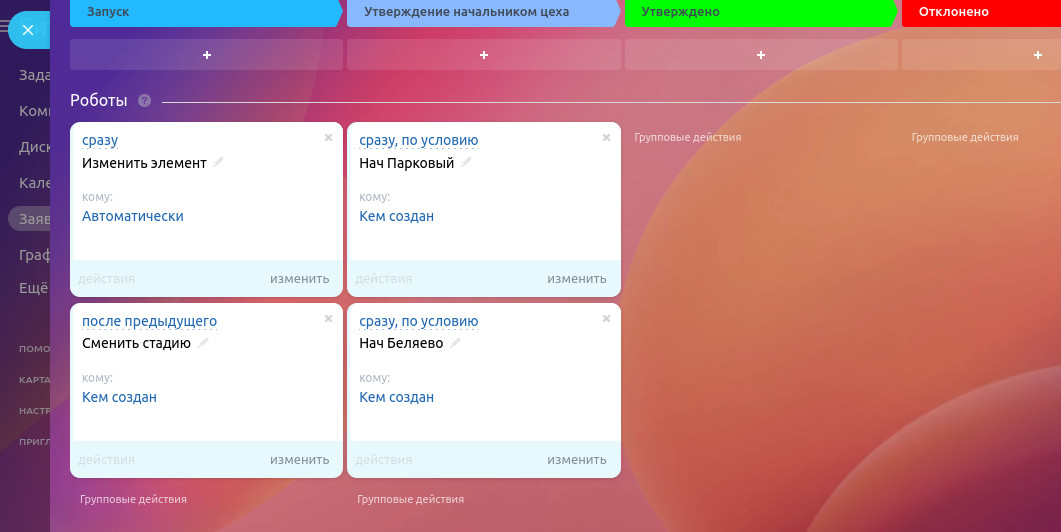 - Создание бизнес-процесса «Заявка на товар»: Начали настройку бизнес-процесса, утвердили поля при запуске и задания на следующем этапе.