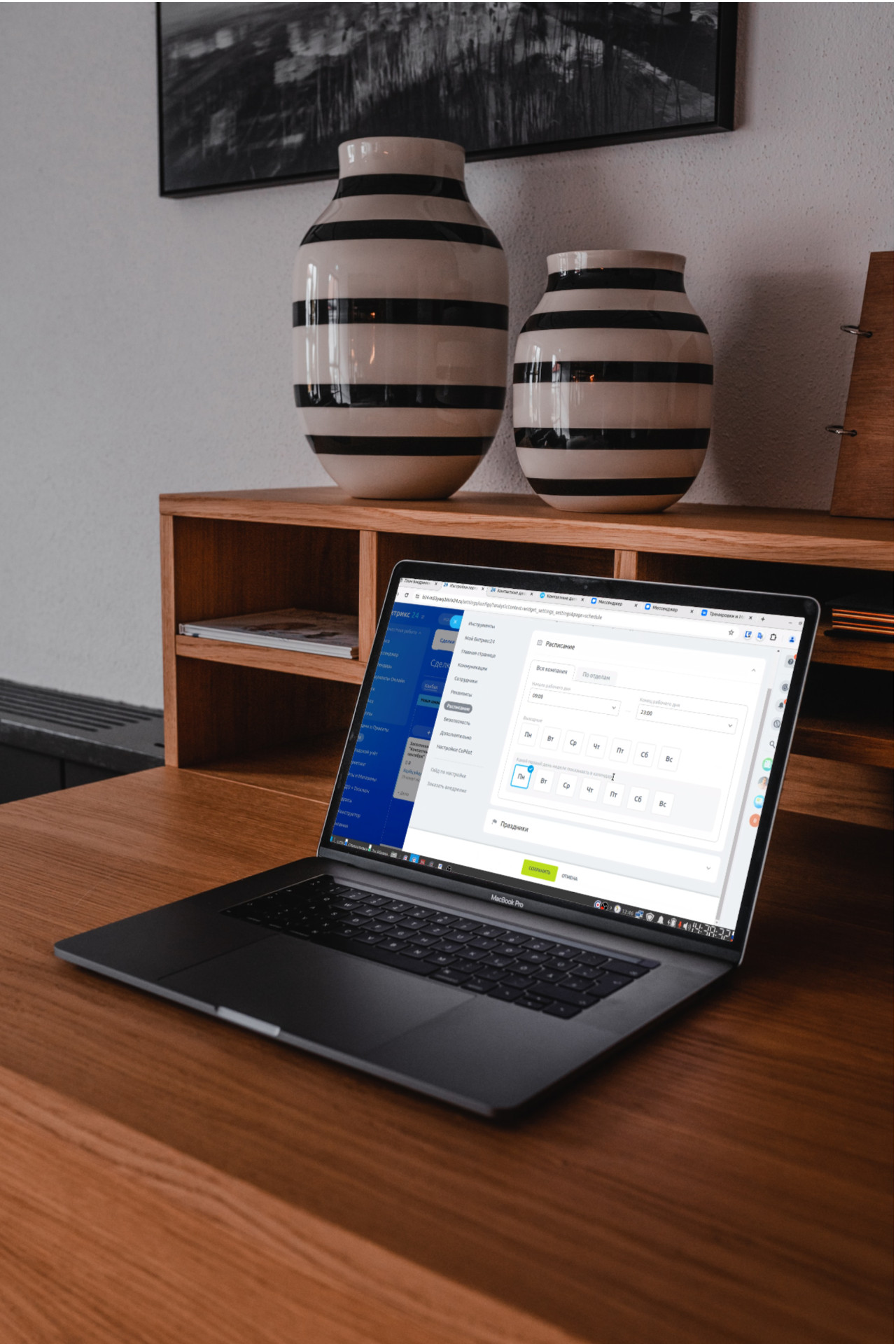 Дополнительные настройки:- В воронке «Курс» добавили стадию "Возврат".- Настроили главное меню и добавили раздел "Список диалогов«.- Добавили отделы в структуру компании и настроили открытые линии.- Создали фильтр «Сделки в работе».