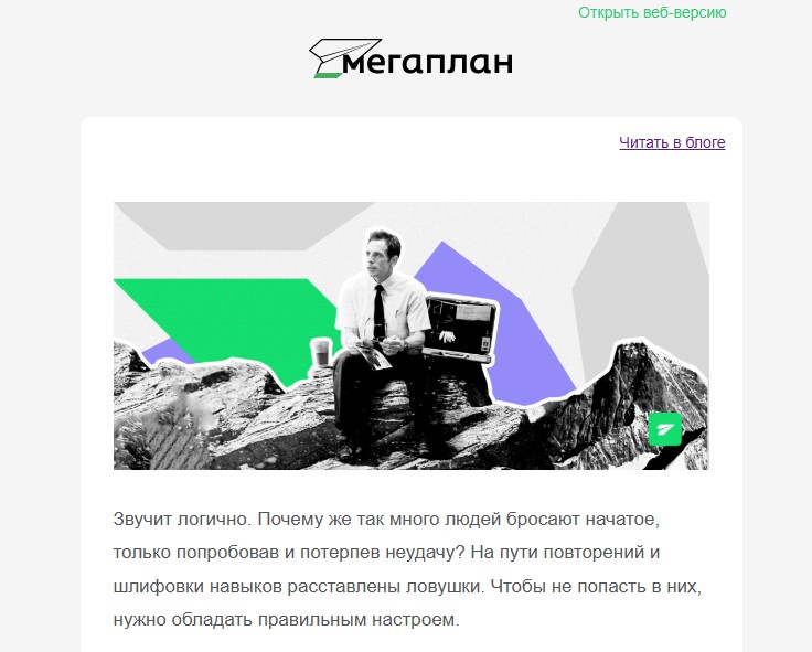 Сейчас наша рассылка выходит 2 раза в неделю. По средам в формате, который был заведён с самого начала, — полезные лонгриды в теле письма. Удобно, что человеку не нужно никуда переходить из письма, он открывает и читает статью в почтовом клиенте. Потом добавили дайджесты по пятницам с 4–5 анонсами и ссылками для перехода на другие ресурсы, потому что у нас возникает много других инфоповодов, которые не уместить в рамки одной рассылки. Подписаться на рассылку мы предлагаем в нашем блоге. Если человек переходит из поиска в статью, читает её и решает уйти, появляется поп-ап с призывом подписаться на рассылку и телеграм-канал, чтобы получать статьи раньше остальных. Лид-магниты мы не используем. Через 2 недели после регистрации пользователя в продукте отправляем ему письмо с предложением подписаться на полезную рассылку. Костяк аудитории рассылки — текущие или бывшие клиенты Мегаплана, но не только они. Нам важны не охваты, а наша ЦА, поэтому я периодически чищу базу. Тех, кто не читал за последние полгода ни одной рассылки, я убираю из основной базы и запускаю для них реактивационную цепочку писем: заново рассказываю, в чём польза рассылки и о чём мы чаще всего пишем. Никакого насилия: если людям интересно, я возвращаю их обратно в основную базу. Когда я пришла в компанию, в базе рассылки было около 120 тысяч подписчиков, сейчас чуть больше 85 тысяч с учётом того, что я каждый год провожу её ревизию. Средний open rate рассылок — 20%. Но было несколько экспериментов, благодаря которым мы повышали его минимум в 2 раза: например, с помощью провокационных заголовков или интриги в названии письма. За всё время существования рассылки у неё сменилось несколько редакторов, появились внештатные авторы, иллюстраторы и корректор. Я начинала как автор блога, потом редактор и, наконец, доросла до главреда. Даю технические задания авторам и иллюстраторам, до сих пор пишу тексты сама, но уже гораздо реже. У нас 5 постоянных авторов-фрилансеров, текучка небольшая. Они пишут на темы личной эффективности, менеджмента, маркетинга и продаж. Если выходит материал, в который нужно добавить примеры из продукта, подключаюсь я: дополняю статью, беру интервью у директора и команды. Статьи из рассылки и блога мы продвигаем в наших соцсетях: Телеграме и ВКонтакте. Соцсети ведёт отдельный штатный сотрудник, с которым у нас проходят ежедневные планёрки для синхронизации действий. Эсэмэмщик заранее выбирает формат для продвижения: это может быть просто текст, картинка и ссылка или полноценные карточки для пролистывания рассказанной истории. По реакциям и комментариям мы понимаем, правильно ли выбрали и хорошо ли раскрыли ту или иную тему. Сначала у нас было медиа на отдельном сайте, которое называлось «Большие планы». Где-то в 2015 году мы оказались на развилке: продолжать развивать своё независимое медиа, в котором изредка писали про Мегаплан, или сближать продукт и блог. В результате выбрали вторую стратегию. Блог дублирует все статьи, которые выходят в рассылке. Таким образом, они живут не 3–4 дня после отправки писем, а остаются на сайте навсегда. За 12 лет накопился большой архив, в котором многие статьи забылись, но не потеряли свою актуальность. Я их «реанимирую», добавляя в дайджест, и у них начинается вторая жизнь — люди читают и оставляют комментарии. Посещаемость блога —